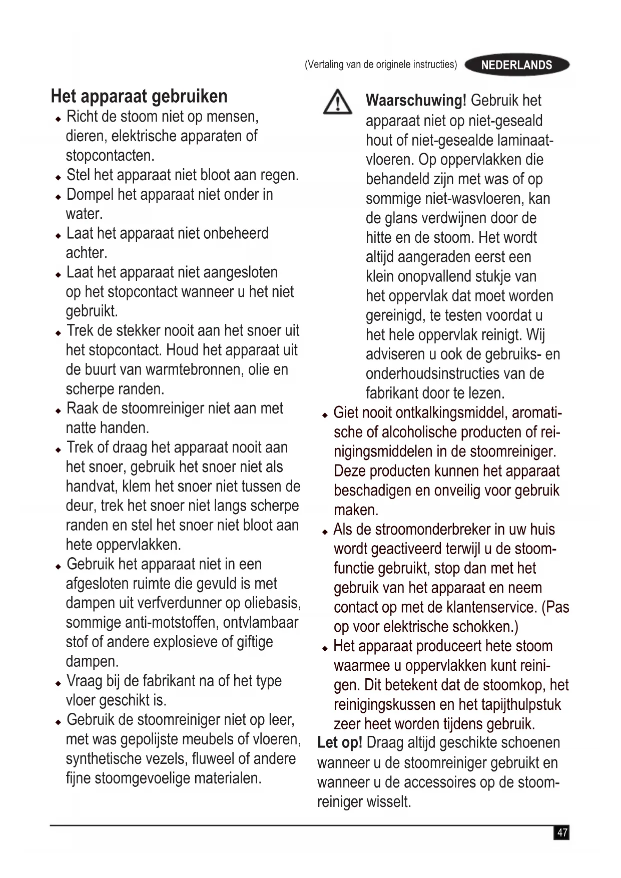 handleiding met de instructies voor de juiste bevestiging van alle onderdelen en accessoires Er ontsnapt stoom uit het apparaat op plaatsen waar u dat niet verwacht