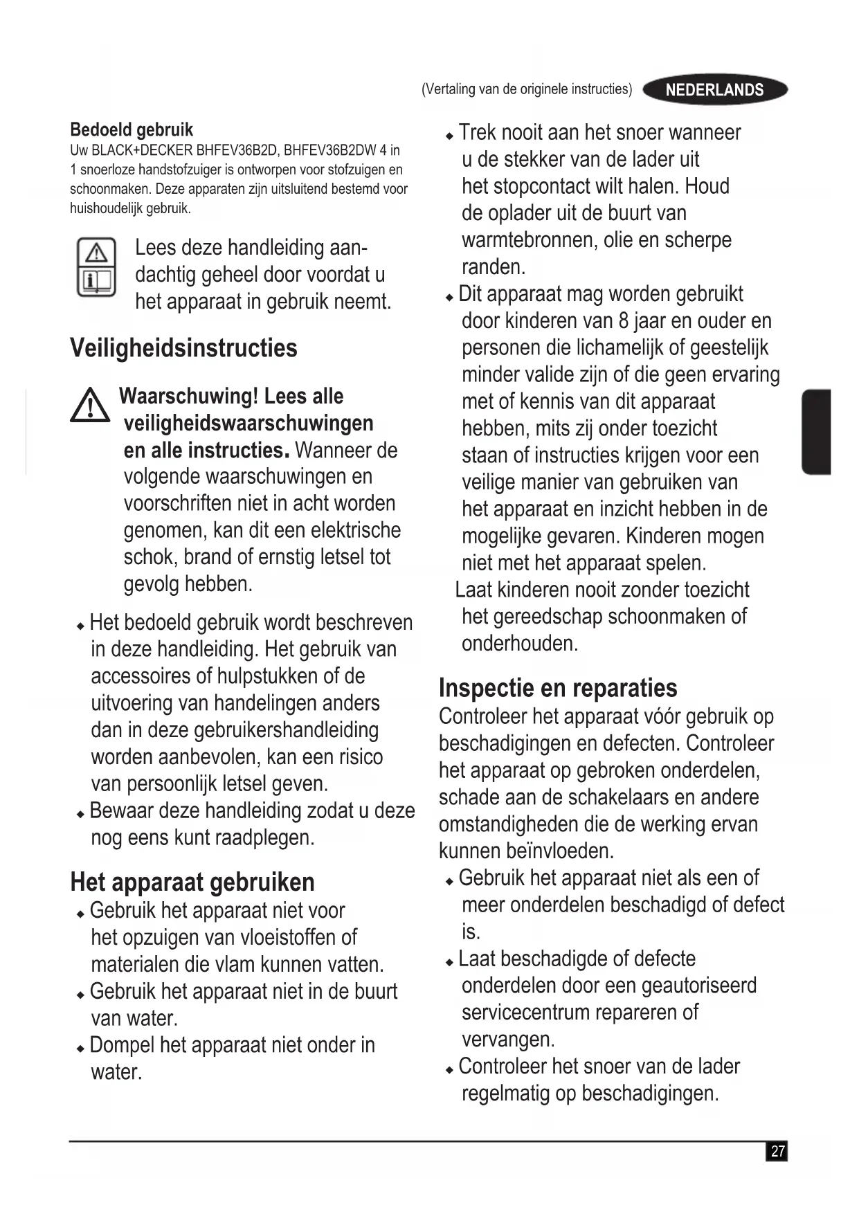 Waarschuwing! Lees alle veiligheidswaarschuwingen en alle instructies. Wanneer de volgende waarschuwingen en voorschriften niet in acht worden genomen, kan dit een elektrische schok, brand of ernstig letsel tot gevolg hebben. u Het bedoeld gebruik wordt beschreven in deze handleiding. Het gebruik van accessoires of hulpstukken of de uitvoering van handelingen anders dan in deze gebruikershandleiding worden aanbevolen, kan een risico van persoonlijk letsel geven. u Bewaar deze handleiding zodat u deze nog eens kunt raadplegen. Het apparaat gebruiken u Gebruik het apparaat niet voor het opzuigen van vloeistoffen of materialen die vlam kunnen vatten. u Gebruik het apparaat niet in de buurt van water. u Dompel het apparaat niet onder in water. u Trek nooit aan het snoer wanneer u de stekker van de lader uit het stopcontact wilt halen. Houd de oplader uit de buurt van warmtebronnen, olie en scherpe randen. u Dit apparaat mag worden gebruikt door kinderen van 8 jaar en ouder en personen die lichamelijk of geestelijk minder valide zijn of die geen ervaring met of kennis van dit apparaat hebben, mits zij onder toezicht staan of instructies krijgen voor een veilige manier van gebruiken van het apparaat en inzicht hebben in de mogelijke gevaren. Kinderen mogen niet met het apparaat spelen. Laat kinderen nooit zonder toezicht het gereedschap schoonmaken of onderhouden. Inspectie en reparaties Controleer het apparaat vóór gebruik op beschadigingen en defecten. Controleer het apparaat op gebroken onderdelen, schade aan de schakelaars en andere omstandigheden die de werking ervan kunnen beïnvloeden. u Gebruik het apparaat niet als een of meer onderdelen beschadigd of defect is. u Laat beschadigde of defecte onderdelen door een geautoriseerd servicecentrum repareren of vervangen. u Controleer het snoer van de lader regelmatig op beschadigingen.28 (Vertaling van de originele instructies) NEDERLANDS Vervang de lader als het snoer beschadigd of defect is. u Probeer nooit andere onderdelen te verwijderen of te vervangen dan de onderdelen die in deze handleiding worden genoemd. Aanvullende Veiligheidsinstructies Na gebruik u Trek de stekker van de lader uit het stopcontact voordat u de lader en het laadstation schoonmaakt. u Berg het apparaat wanneer u het niet gebruikt, op een droge plaats op. u Houd apparaten buiten het bereik van kinderen, ook wanneer ze zijn opgeborgen. Overige risico’s Er kunnen zich bij het gebruik van dit gereedschap nog meer risico’s voordoen, die mogelijk niet in de bijgesloten veiligheidswaarschuwingen worden beschreven. Deze risico’s kunnen zich voordoen door onoordeelkundig gebruik, langdurig gebruik, enz. Zelfs wanneer de veiligheidsvoorschriften in acht worden genomen en de veiligheidsvoorzieningen worden gebruikt, kunnen bepaalde risico’s niet worden uitgesloten. Dit zijn onder meer: u Verwondingen die worden veroorzaakt door het aanraken van draaiende of bewegende onderdelen. u Verwondingen die worden veroorzaakt bij het vervangen van onderdelen, messen of accessoires. u Verwondingen die worden veroorzaakt door langdurig gebruik van gereedschap. Wanneer u langere periodes met gereedschap werkt, kunt u het beste regelmatig een pauze nemen. u Gehoorbeschadiging.u Gezondheidsrisico’s door het inademen van stof dat vrijkomt tijdens het gebruik van uw gereedschap (bijvoorbeeld: het werken met hout, met name eiken, beuken en MDF). Laders De lader is ontworpen voor een bepaalde spanning. Controleer altijd dat de netspanning overeenkomt met de waarde op het typeplaatje. Waarschuwing! Probeer nooit de lader te voorzien van een normale netstekker. u Gebruik de lader van BLACK+DECKER alleen voor de accu’s in het apparaat waarbij de lader is geleverd. Andere batterijen kunnen openbarsten, met persoonlijk letsel en materiële schade tot gevolg. u Niet-oplaadbare accu’s mogen nooit worden opgeladen. u Als het netsnoer is beschadigd, moet het door de fabrikant of door een geautoriseerd BLACK+DECKER- servicecentrum worden vervangen, zodat gevaarlijke situaties worden voorkomen. u Stel de lader niet bloot aan water.u Maak de lader niet open.u Steek niet met een scherp voorwerp in de lader.29 (Vertaling van de originele instructies)NEDERLANDSu Plaats het apparaat/de accu tijdens het laden op een goed geventileerde locatie. Elektrische veiligheid Symbolen op de lader