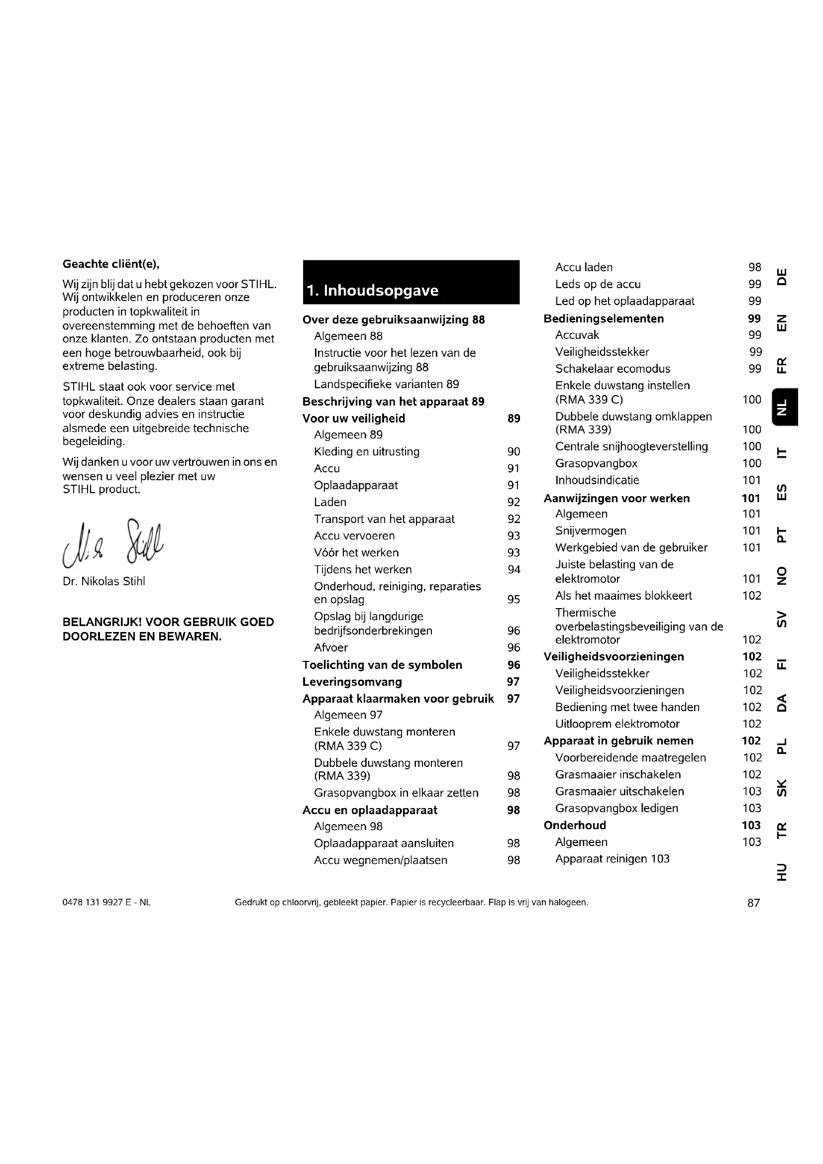 DEENFRITESPTNOSVFIDAPLSKTRHU NL 0478 131 9927 E - NL Geachte cliënt(e), Wij zijn blij dat u hebt gekozen voor STIHL. Wij ontwikkelen en produceren onze producten in topkwaliteit in overeenstemming met de behoeften van onze klanten. Zo ontstaan producten met een hoge betrouwbaarheid, ook bij extreme belasting. STIHL staat ook voor service met topkwaliteit. Onze dealers staan garant voor deskundig advies en instructie alsmede een uitgebreide technische begeleiding. Wij danken u voor uw vertrouwen in ons en wensen u veel plezier met uw STIHL product. Dr. Nikolas Stihl
