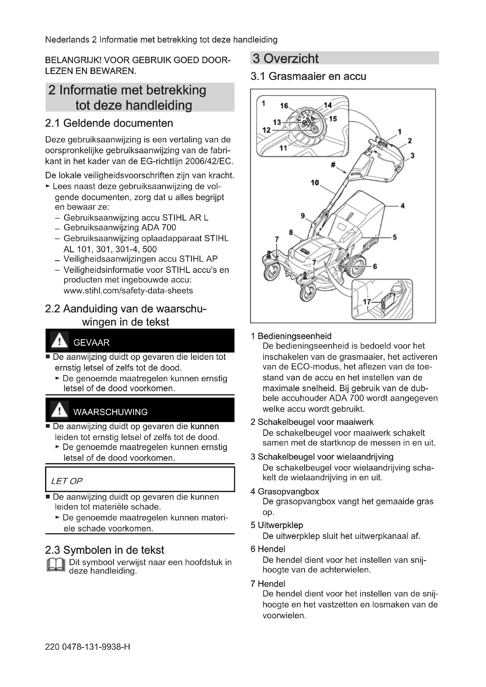 1 Bedieningseenheid De bedieningseenheid is bedoeld voor het inschakelen van de grasmaaier, het activeren van de ECO-modus, het aflezen van de toe‐ stand van de accu en het instellen van de maximale snelheid. Bij gebruik van de dub‐ bele accuhouder ADA 700 wordt aangegeven welke accu wordt gebruikt. 2 Schakelbeugel voor maaiwerk De schakelbeugel voor maaiwerk schakelt samen met de startknop de messen in en uit. 3 Schakelbeugel voor wielaandrijving De schakelbeugel voor wielaandrijving scha‐ kelt de wielaandrijving in en uit. 4 Grasopvangbox De grasopvangbox vangt het gemaaide gras op. 5 Uitwerpklep De uitwerpklep sluit het uitwerpkanaal af. 6 Hendel De hendel dient voor het instellen van snij‐ hoogte van de achterwielen. 7 Hendel De hendel dient voor het instellen van de snij‐ hoogte en het vastzetten en losmaken van de voorwielen. Nederlands 2 Informatie met betrekking tot deze handleiding 220 0478-131-9938-H8 Klep De klep dekt de accu en de veiligheidssleutel af. 9 Hendel De hendel dient voor het instellen en omklap‐ pen van de duwstang. 10 Duwstang De duwstang dient voor het vasthouden, begeleiden en transporteren van de gras‐ maaier. 11 Draaiwiel Het draaiwiel dient voor het instellen van de maximumsnelheid. 12 Startknop De startknop activeert de grasmaaier en schakelt samen met de schakelbeugel voor maaiwerk de messen in. 13 ECO-schakelaar De ECO-schakelaar schakelt de ECO-modus in en uit. 14 Laadtoestandsweergave De leds tonen bij het bedienen van de start‐ knop de laadtoestand en eventuele storingen van de accu. 15 Waarschuwingsdriehoek De waarschuwingsdriehoek geeft storingen in de grasmaaier aan. 16 Weergave voor de dubbele accuhouder ADA 700 De leds geven aan welke accu op dat moment wordt gebruikt. 17 Veiligheidssleutel De veiligheidssleutel activeert de grasmaaier. # Typeplaatje met machinenummer