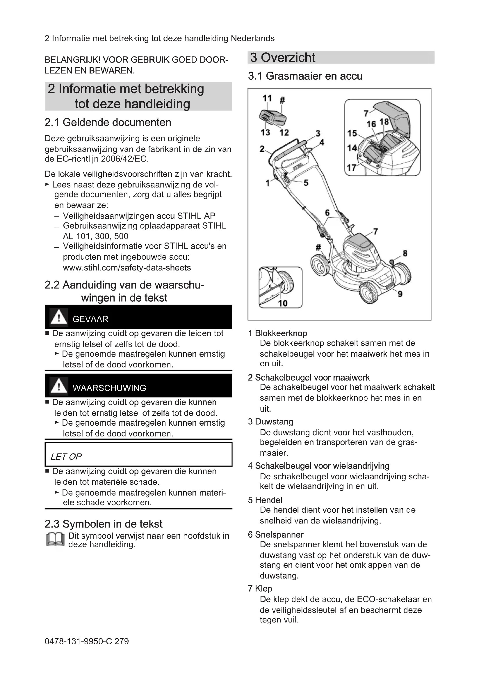 1 Blokkeerknop De blokkeerknop schakelt samen met de schakelbeugel voor het maaiwerk het mes in en uit. 2 Schakelbeugel voor maaiwerk De schakelbeugel voor het maaiwerk schakelt samen met de blokkeerknop het mes in en uit. 3 Duwstang De duwstang dient voor het vasthouden, begeleiden en transporteren van de gras‐ maaier. 4 Schakelbeugel voor wielaandrijving De schakelbeugel voor wielaandrijving scha‐ kelt de wielaandrijving in en uit. 5 Hendel De hendel dient voor het instellen van de snelheid van de wielaandrijving. 6 Snelspanner De snelspanner klemt het bovenstuk van de duwstang vast op het onderstuk van de duw‐ stang en dient voor het omklappen van de duwstang. 7 Klep De klep dekt de accu, de ECO-schakelaar en de veiligheidssleutel af en beschermt deze tegen vuil. 2 Informatie met betrekking tot deze handleiding Nederlands 0478-131-9950-C 2798 Hendel De hendel dient voor het instellen van de snij‐ hoogte van de voorwielen. 9 Transportgreep De transportgreep dient voor het transporte‐ ren van de grasmaaier. 10 Achteras De achteras dient voor het instellen van de snijhoogte van de achterwielen. 11 Accu De accu voorziet de grasmaaier van energie. 12 Drukknop Met de drukknop worden de leds op de accu geactiveerd. 13 Leds De leds geven de laadtoestand van de accu en storingen aan. 14 Accuhouder De accuhouder biedt plaats aan de accu. 15 ECO-schakelaar De ECO-schakelaar schakelt de ECO-modus in en uit. 16 Veiligheidssleutel De veiligheidssleutel activeert de grasmaaier. 17 Blokkeerhendel De blokkeerhendel houdt de accu in de accu‐ houder. RMA 2 RPV: 18 Accuhouder De accuhouder biedt plaats aan een tweede accu. RMA 2 RV: 18 Transporthouder De transporthouder biedt plaats aan een reserveaccu. # Typeplaatje met machinenummer