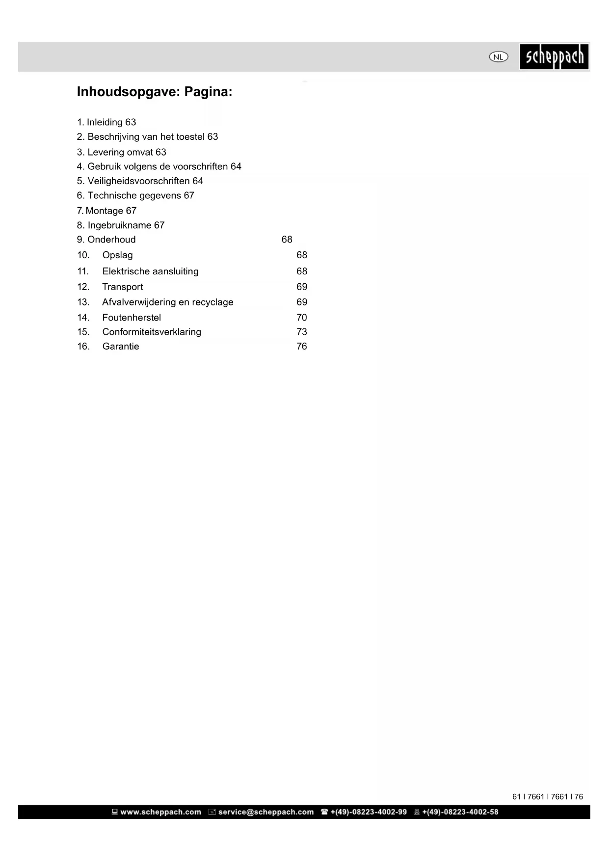 Fabrikant: scheppach Fabrikation von Holzbearbeitungsmaschinen GmbH Günzburger Straße 69 D-89335 Ichenhausen Geachte klant, Wij wensen u veel plezier en succes bij het werken met uw nieuwe apparaat. Advies: Volgens de van toepassing zijnde wet voor produc- taansprakelijkheid is de producent van dit apparaat niet aansprakelijk voor schade die ontstaat door of door middel van dit apparaat in geval van: