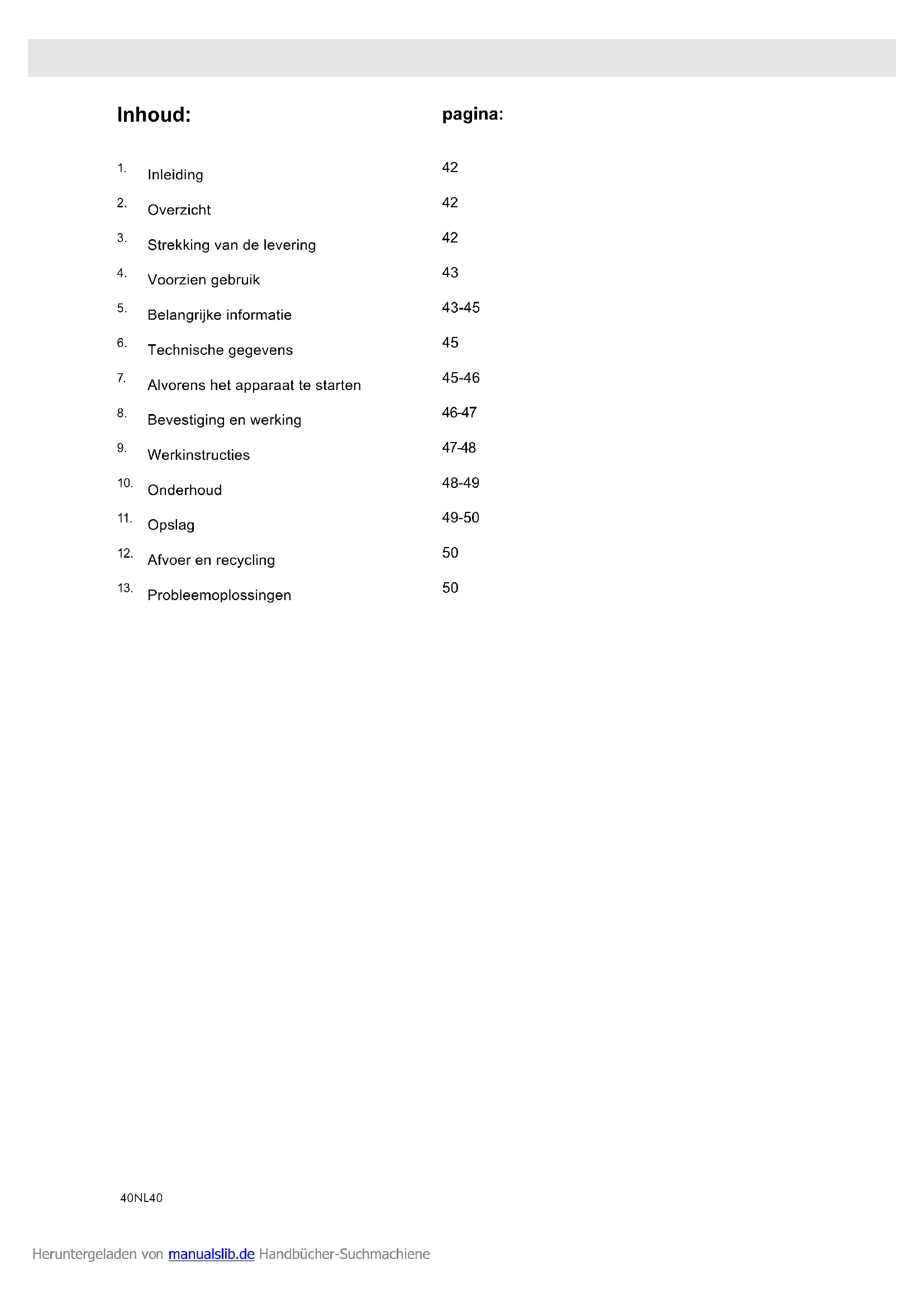 Heruntergeladen von manualslib.de Handbücher-Suchmachiene41NL Lees de gebruikshandlei-ding. Waarschuwing! Er bestaat risico op persoonlijk letsel, verlies van het leven of schade aan het apparaat in geval van niet naleven. Waarschuwing! De uitlaat en andere delen van de mo-tor worden erg heet tijdens het gebruik, raak deze niet aan!