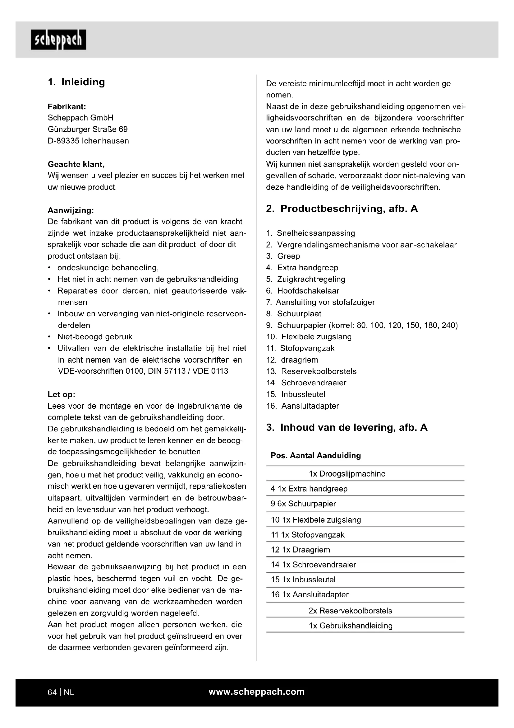 Het beoogd gebruik van dit product omvat het groot- schalig droogslijpen van droogbouwwanden met ge- bruik van geschikte schuurbladen, ter voorbereiding voor het schilderen of behangen. Voor de bewerking van kleinere vlakken evenals hoe- ken en randen is dit product niet geschikt. Het is boven- dien niet geschikt voor het afschuren van behang en mag niet voor natslijpen worden gebruikt. Het product mag niet als door- of ruwslijper, polijster of met staalborstels worden gebruikt. Asbesthoudende materialen mogen niet bewerkt worden met dit product. Het product mag uitsluitend voor het beoogde doel worden gebruikt. Elk ander of verdergaand gebruik is niet volgens de voorschriften. De gebruiker/bedie- ner en niet de fabrikant is aansprakelijk voor ontstane schade of elke vorm van letsel. Ook de naleving van de veiligheidsvoorschriften, de montagehandleiding en de aanwijzingen in de ge- bruikshandleiding maken deel uit van het beoogd ge- bruik. Personen die het product gebruiken of onderhoud aan het product verrichten, moeten hiermee bekend zijn en op de hoogte zijn van de mogelijke gevaren. Bovendien moeten de van kracht zijnde voorschriften ter voorkoming van ongevallen strikt worden nage- leefd. Andere algemene arbo-, gezondheids- en veiligheids- voorschriften moeten in acht worden genomen. De fabrikant is niet aansprakelijk voor wijzigingen die aan het product worden aangebracht en de hieruit voortvloeiende schade. Het product mag uitsluitend met de originele onderde- len en originele accessoires van de fabrikant worden gebruikt. De veiligheids-, werk- en onderhoudsvoorschriften van de fabrikant alsook de in de technische gegevens aan- gegeven afmetingen moeten in acht worden genomen. Let erop dat onze producten volgens het beoogd ge- bruik niet voor bedrijfsmatige, ambachtelijke of indus- triële toepassingen zijn ontworpen. Wij aanvaarden geen aansprakelijkheid wanneer het product in be- drijfsmatige, ambachtelijke of industriële ondernemin- gen of bij soortgelijke werkzaamheden worden ingezet. De fabrikant is niet aansprakelijk voor schade die het gevolg is van oneigenlijk gebruik of onjuiste bediening.www.scheppach.com