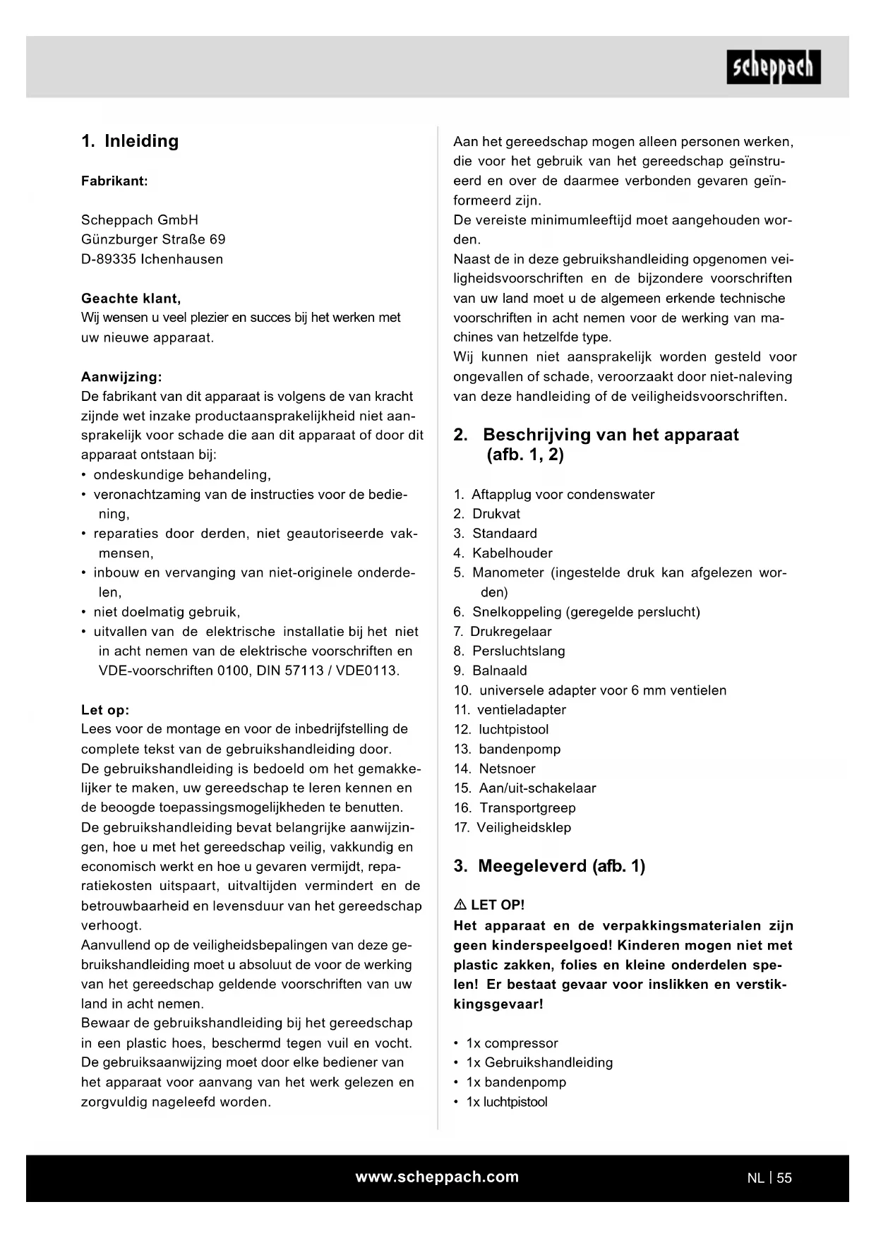 Fabrikant: Scheppach GmbH Günzburger Straße 69 D-89335 Ichenhausen Geachte klant, Wij wensen u veel plezier en succes bij het werken met uw nieuwe apparaat. Aanwijzing: De fabrikant van dit apparaat is volgens de van kracht zijnde wet inzake productaansprakelijkheid niet aan- sprakelijk voor schade die aan dit apparaat of door dit apparaat ontstaan bij: