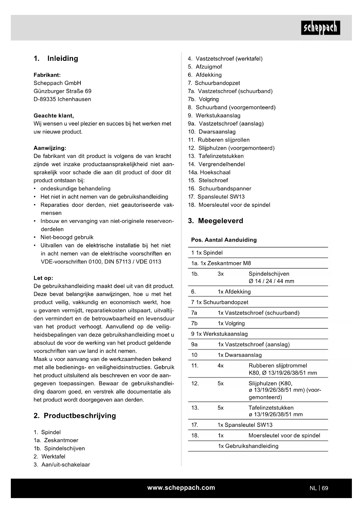 Fabrikant: Scheppach GmbH Günzburger Straße 69 D-89335 Ichenhausen Geachte klant, Wij wensen u veel plezier en succes bij het werken met uw nieuwe product. Aanwijzing: De fabrikant van dit product is volgens de van kracht zijnde wet inzake productaansprakelijkheid niet aan- sprakelijk voor schade die aan dit product of door dit product ontstaan bij: