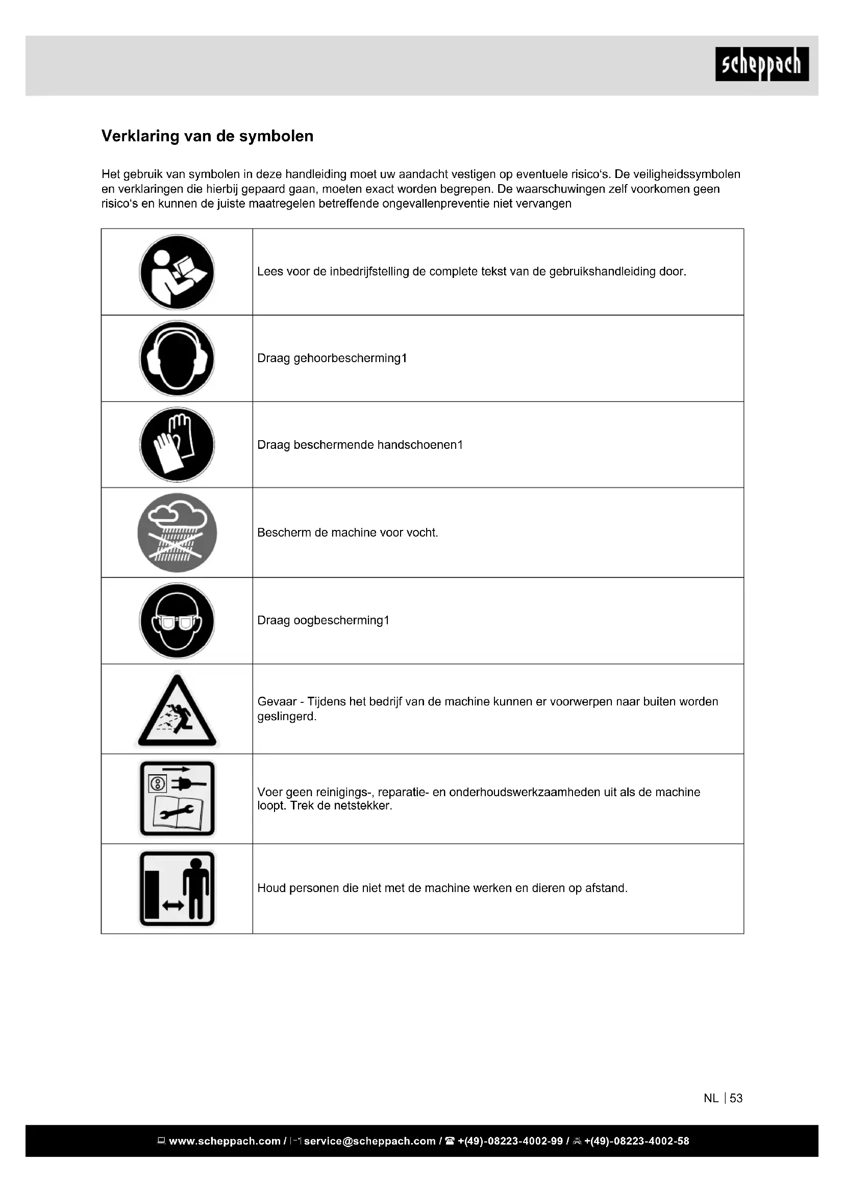 53Let op! Letselgevaar door roterende diametrale schijf ! Houd handen en voeten buiten de openingen als de machine loopt. Niet gebruiken als een stap. m Let op! In deze gebruiksaanwijzing hebben we de plaatsen, die met uw veiligheid te maken heb- ben, van dit teken voorzien. www.scheppach.com / service@scheppach.com / +(49)-08223-4002-99 / +(49)-08223-4002-58