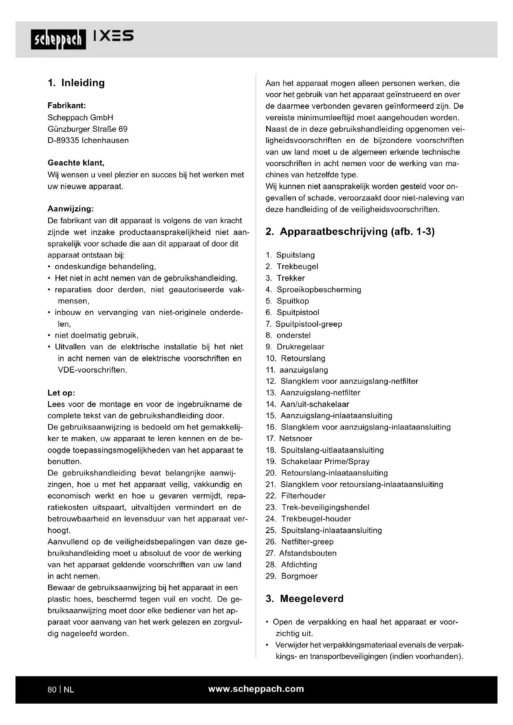 Het Airless verfsproeisysteem is geschikt voor grote renoveringswerkzaamheden in huis en de tuin. Het is zo ontwikkeld, dat verf direct uit de verfemmer wordt aangezogen en in korte tijd op grote oppervlakken kan worden aangebracht. Daartoe behoren oppervlak- ken zoals hekken, pergola’s, schuren, houten faça- des, paviljoens, garagedeuren, roosters en wanden. Het apparaat is alleen bedoeld voor privé-gebruik. In hoofdstuk 8 vindt u meer informatie over welke appara- ten met het apparaat gebruikt kunnen worden. Lees deze gebruikshandleiding door en maak u daar- mee vertrouwd, voordat u het apparaat gebruikt. Deze gebruikshandleiding moet ook worden doorge- geven als het apparaat door derden wordt gebruikt. Het apparaat mag uitsluitend voor het beoogde doel worden gebruikt. Elk ander of verdergaand gebruik is niet volgens de voorschriften. Voor hieruit ontstane schade of verwondingen, van welke soort dan ook, is de gebruiker en niet de fabri- kant aansprakelijk. De fabrikant is niet aansprakelijk voor wijzigingen die aan de machine worden aangebracht en de hieruit voortvloeiende schade.www.scheppach.com