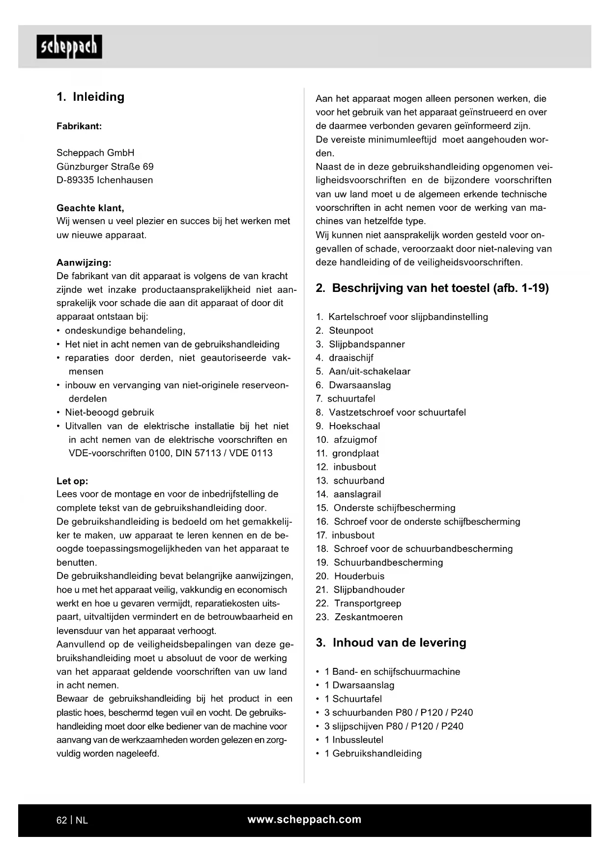 De band- en schijfschuurmachine wordt gebruikt voor het schuren alle soorten hout, overeenkomstig de ma- chinegrootte. De machine mag uitsluitend voor het voorgeschreven doel worden gebruikt. Elk ander of verdergaand ge- bruik is niet volgens de voorschriften. De gebruiker/ bediener en niet de fabrikant is aansprakelijk voor ont- stane schade of elke vorm van letsel. Ook de naleving van de veiligheidsvoorschriften, de montagehandleiding en de aanwijzingen in de ge- bruikshandleiding maken deel uit van het beoogd ge- bruik. Personen die de machine bedienen of die onderhoud aan de machine verrichten, moeten hiermee bekend zijn en op de hoogte zijn van de mogelijke gevaren. Bovendien moeten de van kracht zijnde voorschriften ter voorkoming van ongevallen strikt worden nage- leefd. Andere algemene arbo-, gezondheids- en veiligheids- voorschriften moeten in acht worden genomen. De fabrikant is niet aansprakelijk voor wijzigingen die aan de machine worden aangebracht en de hieruit voortvloeiende schade. De machine mag uitsluitend met de originele onderde- len en originele accessoires van de fabrikant worden gebruikt. De veiligheids-, werk- en onderhoudsvoorschriften van de fabrikant alsook de in de technische gegevens aan- gegeven afmetingen moeten in acht worden genomen. Let erop dat onze apparaten volgens het beoogd ge- bruik niet voor bedrijfsmatige, ambachtelijke of indus- triële toepassingen zijn ontworpen. Wij aanvaarden geen aansprakelijkheid wanneer het apparaat in be- drijfsmatige, ambachtelijke of industriële ondernemin- gen of bij soortgelijke werkzaamheden wordt ingezet. Het apparaat is bedoeld voor gebruik door volwasse- nen. Jongeren vanaf 16 jaar mogen het apparaat alleen onder toezicht gebruiken. De fabrikant is niet aanspra- kelijk voor schade die het gevolg is van oneigenlijk ge- bruik of onjuiste bediening.www.scheppach.com