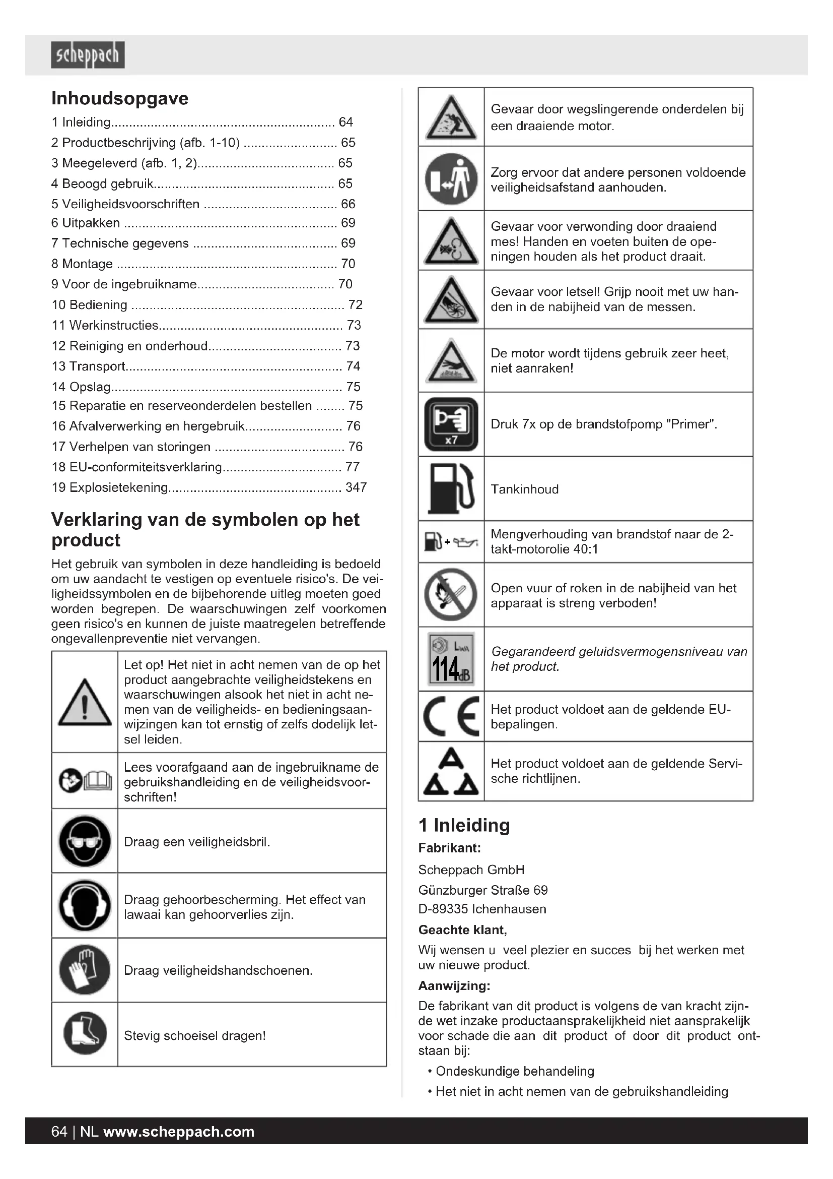 - Gebruik het product nooit met defecte veiligheids- voorzieningen of zonder veiligheidsvoorzieningen. 66 | NL www.scheppach.comWAARSCHUWING Brandstof is zeer ontvlambaar: