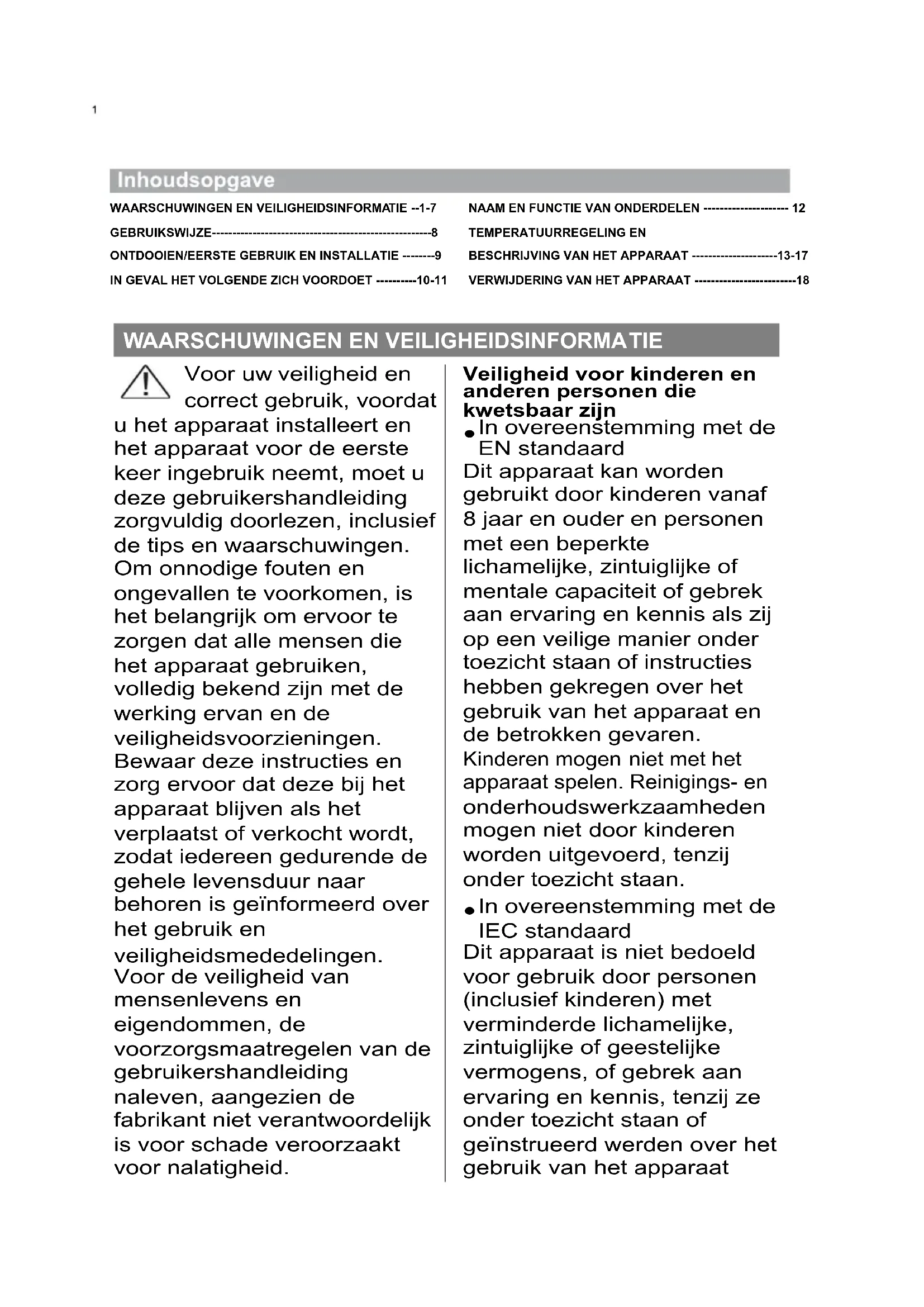 - Het apparaat is uitsluitend bedoeld voor het bewaren van voedsel en/of dranken voor een normale consumptie in normale huishoudens, zoalsuitgelegd in dit instructieboekje Het apparaat is zwaar. Voorzichtigheid is geboden bij het verplaatsen.