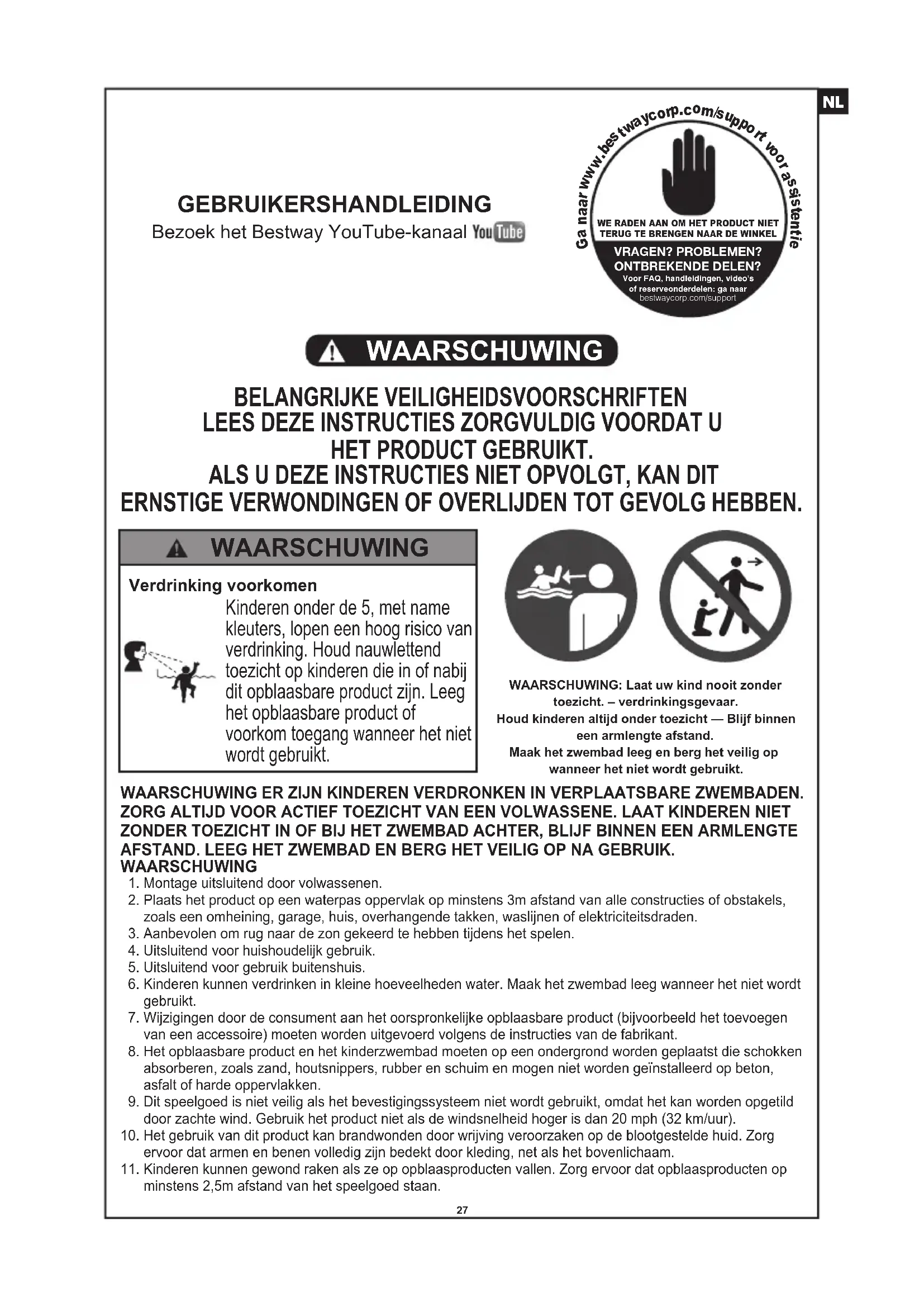 HET PRODUCT GEBRUIKT. ALS U DEZE INSTRUCTIES NIET OPVOLGT, KAN DIT ERNSTIGE VERWONDINGEN OF OVERLIJDEN TOT GEVOLG HEBBEN. WAARSCHUWING Verdrinking voorkomen Kinderen onder de 5, met name kleuters, lopen een hoog risico van verdrinking. Houd nauwlettend toezicht op kinderen die in of nabij dit opblaasbare product zijn. Leeg het opblaasbare product of voorkom toegang wanneer het niet wordt gebruikt. WAARSCHUWING WAARSCHUWING: Laat uw kind nooit zonder toezicht. – verdrinkingsgevaar.Houd kinderen altijd onder toezicht — Blijf binnen een armlengte afstand.Maak het zwembad leeg en berg het veilig op wanneer het niet wordt gebruikt.WAARSCHUWING ER ZIJN KINDEREN VERDRONKEN IN VERPLAATSBARE ZWEMBADEN. ZORG ALTIJD VOOR ACTIEF TOEZICHT VAN EEN VOLWASSENE. LAAT KINDEREN NIET ZONDER TOEZICHT IN OF BIJ HET ZWEMBAD ACHTER, BLIJF BINNEN EEN ARMLENGTE AFSTAND. LEEG HET ZWEMBAD EN BERG HET VEILIG OP NA GEBRUIK.WAARSCHUWING 1. Montage uitsluitend door volwassenen. 2. Plaats het product op een waterpas oppervlak op minstens 3m afstand van alle constructies of obstakels, zoals een omheining, garage, huis, overhangende takken, waslijnen of elektriciteitsdraden. 3. Aanbevolen om rug naar de zon gekeerd te hebben tijdens het spelen. 4. Uitsluitend voor huishoudelijk gebruik. 5. Uitsluitend voor gebruik buitenshuis. 6. Kinderen kunnen verdrinken in kleine hoeveelheden water. Maak het zwembad leeg wanneer het niet wordt gebruikt. 7. Wijzigingen door de consument aan het oorspronkelijke opblaasbare product (bijvoorbeeld het toevoegen van een accessoire) moeten worden uitgevoerd volgens de instructies van de fabrikant. 8. Het opblaasbare product en het kinderzwembad moeten op een ondergrond worden geplaatst die schokken absorberen, zoals zand, houtsnippers, rubber en schuim en mogen niet worden geïnstalleerd op beton, asfalt of harde oppervlakken. 9. Dit speelgoed is niet veilig als het bevestigingssysteem niet wordt gebruikt, omdat het kan worden opgetild door zachte wind. Gebruik het product niet als de windsnelheid hoger is dan 20 mph (32 km/uur).10. Het gebruik van dit product kan brandwonden door wrijving veroorzaken op de blootgestelde huid. Zorg ervoor dat armen en benen volledig zijn bedekt door kleding, net als het bovenlichaam.11. Kinderen kunnen gewond raken als ze op opblaasproducten vallen. Zorg ervoor dat opblaasproducten op minstens 2,5m afstand van het speelgoed staan.12. Bewaar de montage- en installatie-instructies voor toekomstige referentie.