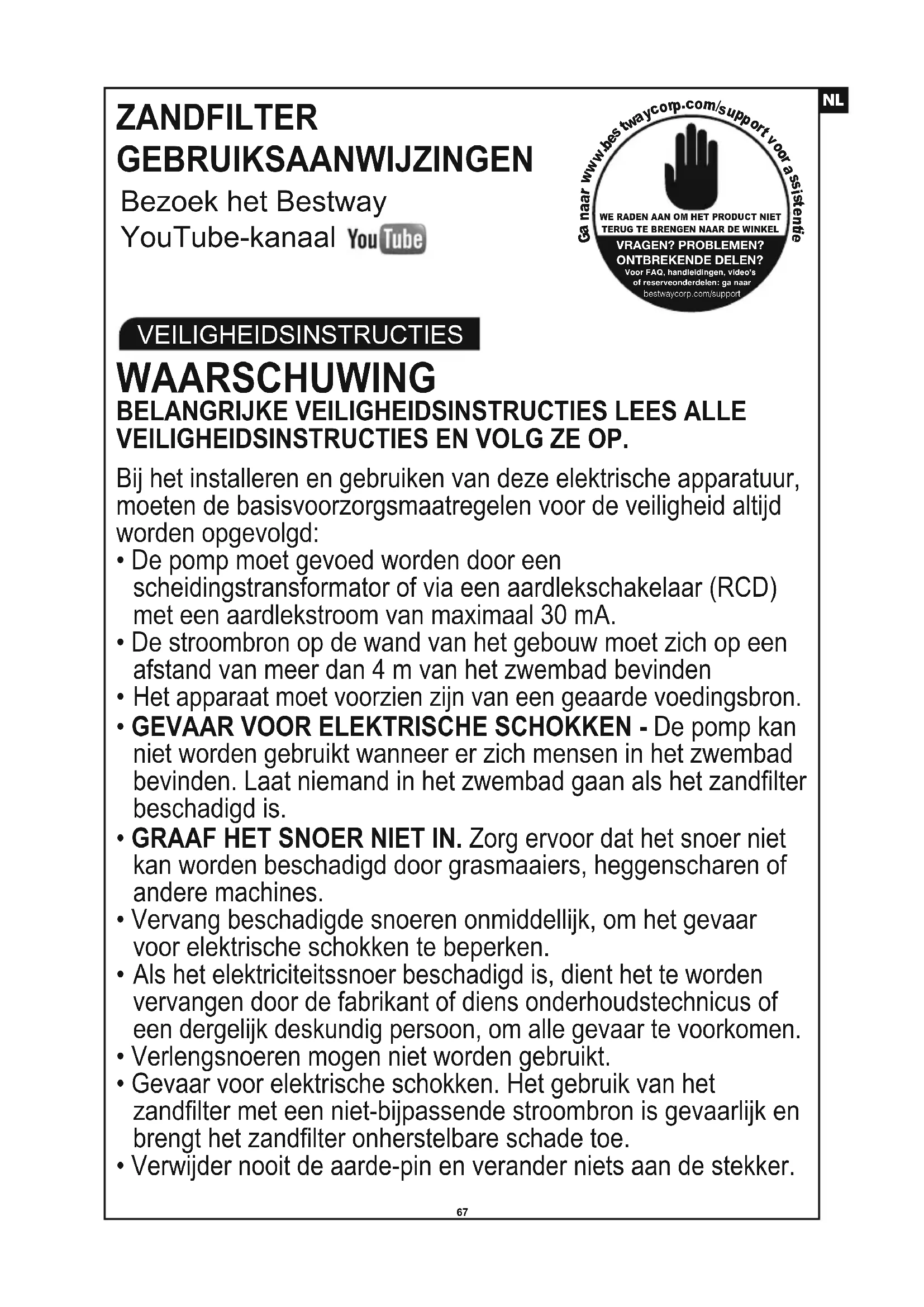 - GEVAAR VOOR ELEKTRISCHE SCHOKKEN - De pomp kan niet worden gebruikt wanneer er zich mensen in het zwembad bevinden. Laat niemand in het zwembad gaan als het zandfilter beschadigd is.