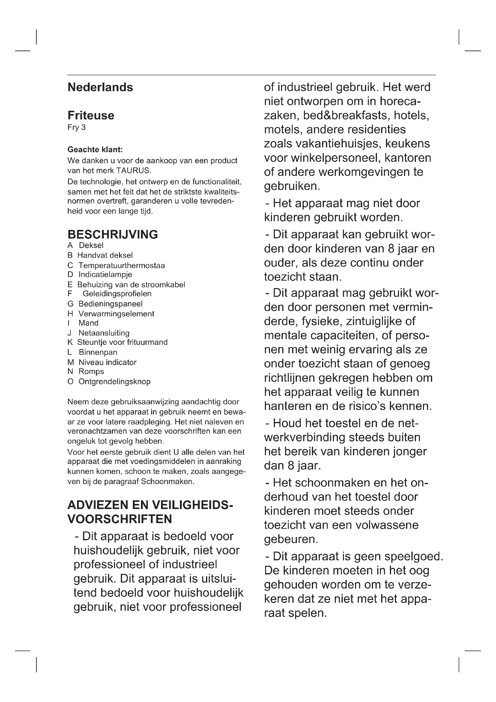 - Os materiais que constituem a embalagem deste aparelho estão integrados num sistema derecolha,classicaçãoereciclagem.Caso deseje desfazer-se deles, pode utilizar os contentores públicos apropriados para cada tipo de material. - O produto está isento de concentrações de substâncias que podem ser consideradas noci- vas para o ambiente.Estesímbolosignicaquesedesejar desfazer-se do produto depois de terminada a sua vida útil, deve entregá-lo através dos meios adequados ao cuidado de um gestor de resíduos autorizado para a recolha selectiva de Resíduos de Equipamentos Eléctricos e Electrónicos (REEE). Este aparelho cumpre a Directiva 2006/95/CE de Baixa Tensão, a Directiva 2004/108/CE de Compatibilidade Electromagnética, a Directiva 2011/65/CE sobre restrições à utilização de de- terminadas substâncias perigosas em aparelhos eléctricos e electrónicos e a Directiva 2009/125/ CE sobre os requisitos de design ecológico apli- cável aos produtos relacionados com a energia.Nederlands Friteuse Fry 3 Geachte klant: We danken u voor de aankoop van een product van het merk TAURUS. De technologie, het ontwerp en de functionaliteit, samen met het feit dat het de striktste kwaliteits- normen overtreft, garanderen u volle tevreden- heid voor een lange tijd. BESCHRIJVING A Deksel B Handvat deksel C Temperatuurthermostaa D Indicatielampje E Behuizing van de stroomkabel F Geleidingsproelen G Bedieningspaneel H Verwarmingselement I Mand J Netaansluiting K Steuntje voor frituurmand L Binnenpan M Niveau indicator N Romps O Ontgrendelingsknop Neem deze gebruiksaanwijzing aandachtig door voordat u het apparaat in gebruik neemt en bewa- ar ze voor latere raadpleging. Het niet naleven en veronachtzamen van deze voorschriften kan een ongeluk tot gevolg hebben. Voor het eerste gebruik dient U alle delen van het apparaat die met voedingsmiddelen in aanraking kunnen komen, schoon te maken, zoals aangege- ven bij de paragraaf Schoonmaken.