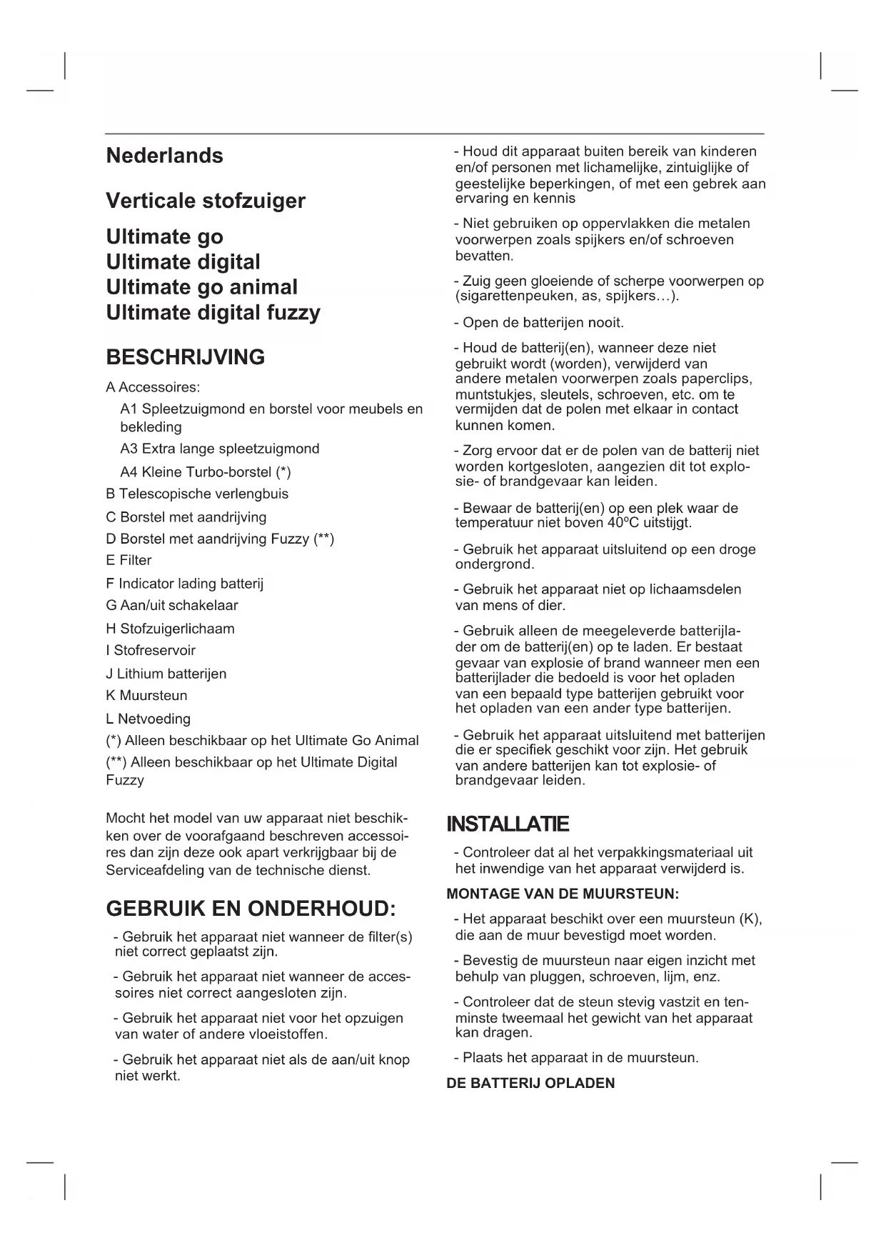 L’INTERIOR DE L’APARELL: - Advertiment: És important que les bateries es trobin completament descarregades abans de procedir a la seva retirada de l’aparell. - Advertiment: l’aparell ha d’estar desconnectat de l’alimentació quan es retirin les bateries. PER A RETIRAR LES BATERIES, UNA VEGA- DA FINALITZADA LA VIDA DE L’APARELL, PROCEDIR COM SEGUEIX: - Obrir la carcassa superior de l’aparell, retirant prèviament amb l’ajuda d’un tornavís els cara- gols de xació (Fig. 7). - Extregui amb seguretat la bateria del seu allotjament.Nederlands Verticale stofzuiger Ultimate go Ultimate digital Ultimate go animal Ultimate digital fuzzy BESCHRIJVING A Accessoires: A1 Spleetzuigmond en borstel voor meubels en bekleding A3 Extra lange spleetzuigmond A4 Kleine Turbo-borstel (*) B Telescopische verlengbuis C Borstel met aandrijving D Borstel met aandrijving Fuzzy (**) E Filter F Indicator lading batterij G Aan/uit schakelaar H Stofzuigerlichaam I Stofreservoir J Lithium batterijen K Muursteun L Netvoeding (*) Alleen beschikbaar op het Ultimate Go Animal (**) Alleen beschikbaar op het Ultimate Digital Fuzzy Mocht het model van uw apparaat niet beschik- ken over de voorafgaand beschreven accessoi- res dan zijn deze ook apart verkrijgbaar bij de Serviceafdeling van de technische dienst. GEBRUIK EN ONDERHOUD: - Gebruik het apparaat niet wanneer de lter(s) niet correct geplaatst zijn. - Gebruik het apparaat niet wanneer de acces- soires niet correct aangesloten zijn. - Gebruik het apparaat niet voor het opzuigen van water of andere vloeistoffen. - Gebruik het apparaat niet als de aan/uit knop niet werkt. - Houd dit apparaat buiten bereik van kinderen en/of personen met lichamelijke, zintuiglijke of geestelijke beperkingen, of met een gebrek aan ervaring en kennis - Niet gebruiken op oppervlakken die metalen voorwerpen zoals spijkers en/of schroeven bevatten. - Zuig geen gloeiende of scherpe voorwerpen op (sigarettenpeuken, as, spijkers…). - Open de batterijen nooit. - Houd de batterij(en), wanneer deze niet gebruikt wordt (worden), verwijderd van andere metalen voorwerpen zoals paperclips, muntstukjes, sleutels, schroeven, etc. om te vermijden dat de polen met elkaar in contact kunnen komen. - Zorg ervoor dat er de polen van de batterij niet worden kortgesloten, aangezien dit tot explo- sie- of brandgevaar kan leiden. - Bewaar de batterij(en) op een plek waar de temperatuur niet boven 40ºC uitstijgt. - Gebruik het apparaat uitsluitend op een droge ondergrond. - Gebruik het apparaat niet op lichaamsdelen van mens of dier. - Gebruik alleen de meegeleverde batterijla- der om de batterij(en) op te laden. Er bestaat gevaar van explosie of brand wanneer men een batterijlader die bedoeld is voor het opladen van een bepaald type batterijen gebruikt voor het opladen van een ander type batterijen. - Gebruik het apparaat uitsluitend met batterijen die er speciek geschikt voor zijn. Het gebruik van andere batterijen kan tot explosie- of brandgevaar leiden. INSTALLATIE - Controleer dat al het verpakkingsmateriaal uit het inwendige van het apparaat verwijderd is. MONTAGE VAN DE MUURSTEUN: - Het apparaat beschikt over een muursteun (K), die aan de muur bevestigd moet worden. - Bevestig de muursteun naar eigen inzicht met behulp van pluggen, schroeven, lijm, enz. - Controleer dat de steun stevig vastzit en ten- minste tweemaal het gewicht van het apparaat kan dragen. - Plaats het apparaat in de muursteun. DE BATTERIJ OPLADEN- Waarschuwing: Nieuwe batterijen zijn bij aan- schaf niet volledig opgeladen en moeten voor het eerste gebruik geheel worden opgeladen. - De batterij moet worden opgeladen bij een omgevingstemperatuur tussen 4 en 40ºC. - Steek de batterijlader (L) in het stopcontact. - Het controlelampje brandt wanneer de lader gereed is om de batterij op te laden. - Het duurt ongeveer 4 tot 5 uur om de batte- rij volledig op te laden. De batterij moet niet langer worden opgeladen (hoewel het wordt aanbevolen de eerste keer 6 uur te laden). - Steek de stekker van de batterijlader in het contact van het apparaat op de zijkant van het apparaat. - Tijdens het laden van de batterij zal het contro- lelampje aangaan, ter indicatie dat de batterij wordt opgeladen. - Trek de stekker van de lader uit het stopcontact als de batterij opgeladen is. - Opmerking: Gebruik het toestel niet terwijl het op de lader is aangesloten.