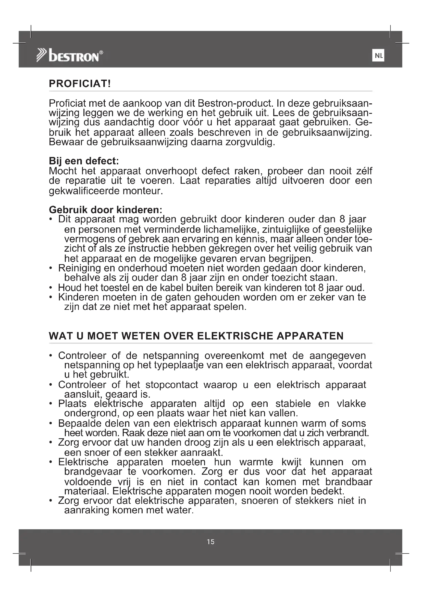 PROFICIAT! Proficiat met de aankoop van dit Bestron-product. In deze gebruiksaan- wijzing leggen we de werking en het gebruik uit. Lees de gebruiksaan- wijzing dus aandachtig door vóór u het apparaat gaat gebruiken. Ge- bruik het apparaat alleen zoals beschreven in de gebruiksaanwijzing. Bewaar de gebruiksaanwijzing daarna zorgvuldig. Bij een defect: Mocht het apparaat onverhoopt defect raken, probeer dan nooit zélf de reparatie uit te voeren. Laat reparaties altijd uitvoeren door een gekwalificeerde monteur. Gebruik door kinderen: