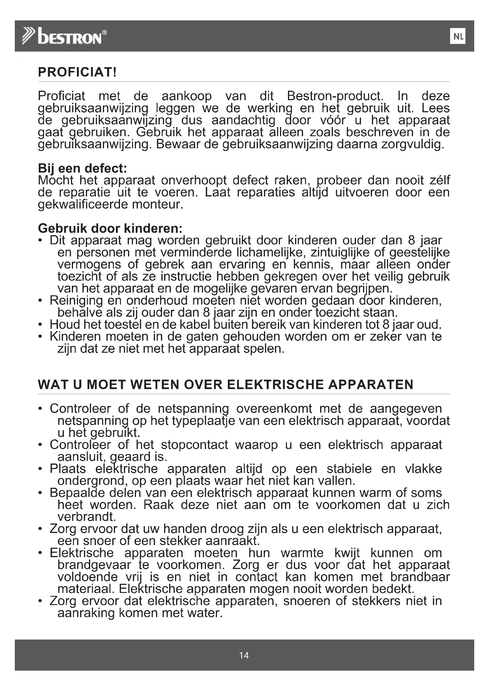 FRPROFICIAT! Proficiat met de aankoop van dit Bestron-product. In deze gebruiksaanwijzing leggen we de werking en het gebruik uit. Lees de gebruiksaanwijzing dus aandachtig door vóór u het apparaat gaat gebruiken. Gebruik het apparaat alleen zoals beschreven in de gebruiksaanwijzing. Bewaar de gebruiksaanwijzing daarna zorgvuldig. Bij een defect: Mocht het apparaat onverhoopt defect raken, probeer dan nooit zélf de reparatie uit te voeren. Laat reparaties altijd uitvoeren door een gekwalificeerde monteur. Gebruik door kinderen: