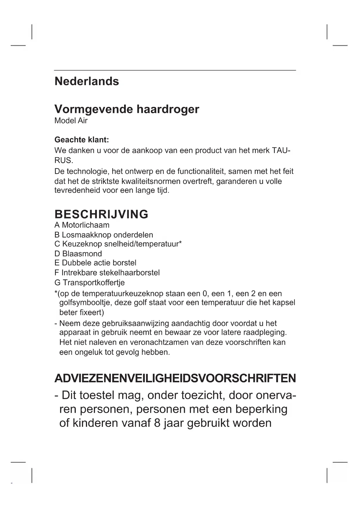 DEL PRODUCTE - Els materials que componen l’envàs d’aquest electro- domèstic estan integrats en un sistema de recollida, classi- cació i reciclatge. Si desitja desfer-se’n, pot utilitzar els contenidors públics apropiats per a cada tipus de material. - Aquest producte està exempt de concentracions de substàn- cies que es puguin conside- rar perjudicials per al medi ambient. Aquest símbol signica que si us voleu desfer del producte, un cop exhaurida la vida de l’aparell, l’heu de dipositar, a través dels mitjans adequats, a mans d’un gestor de residus autoritzat per a la recollida selectiva de Residus d’Aparells Elèctrics i Electrònics (RAEE). Aquest aparell compleix amb la Directiva 2014/35/EU de Baixa Tensió, amb la Directiva 2014/30/EU de Compatibili- tat Electromagnètica, amb la Directiva 2011/65/EU sobre res- triccions a la utilització de deter- minades substàncies perilloses en aparells elèctrics i electrònics i amb la Directiva 2009/125/EC sobre els requisits de disseny ecològic aplicable als productes relacionats amb l’energia.Nederlands Vormgevende haardroger Model Air Geachte klant: We danken u voor de aankoop van een product van het merk TAU- RUS. De technologie, het ontwerp en de functionaliteit, samen met het feit dat het de striktste kwaliteitsnormen overtreft, garanderen u volle tevredenheid voor een lange tijd. BESCHRIJVING A Motorlichaam B Losmaakknop onderdelen C Keuzeknop snelheid/temperatuur* D Blaasmond E Dubbele actie borstel F Intrekbare stekelhaarborstel G Transportkoertje *(op de temperatuurkeuzeknop staan een 0, een 1, een 2 en een golfsymbooltje, deze golf staat voor een temperatuur die het kapsel beter xeert) - Neem deze gebruiksaanwijzing aandachtig door voordat u het apparaat in gebruik neemt en bewaar ze voor latere raadpleging. Het niet naleven en veronachtzamen van deze voorschriften kan een ongeluk tot gevolg hebben.
