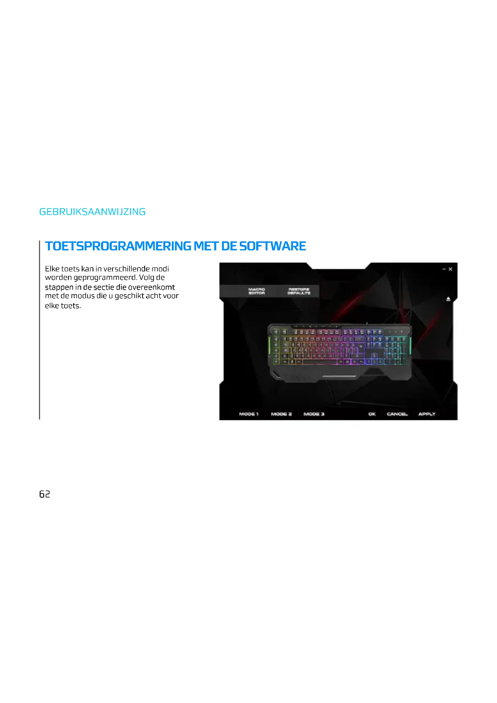 MACRO-INSTELLING Selecteer een toets die is bewerkt of maak een nieuwe. Druk op ‘M1’, vervolgens op ‘REC’ en druk op de gewenste macrotoets waarin u wilt opnemen. Druk een laatste keer op ‘REC’ om de opname te voltooien Opmerking: de led-indicatoren gaan knipperenNEDERLANDS