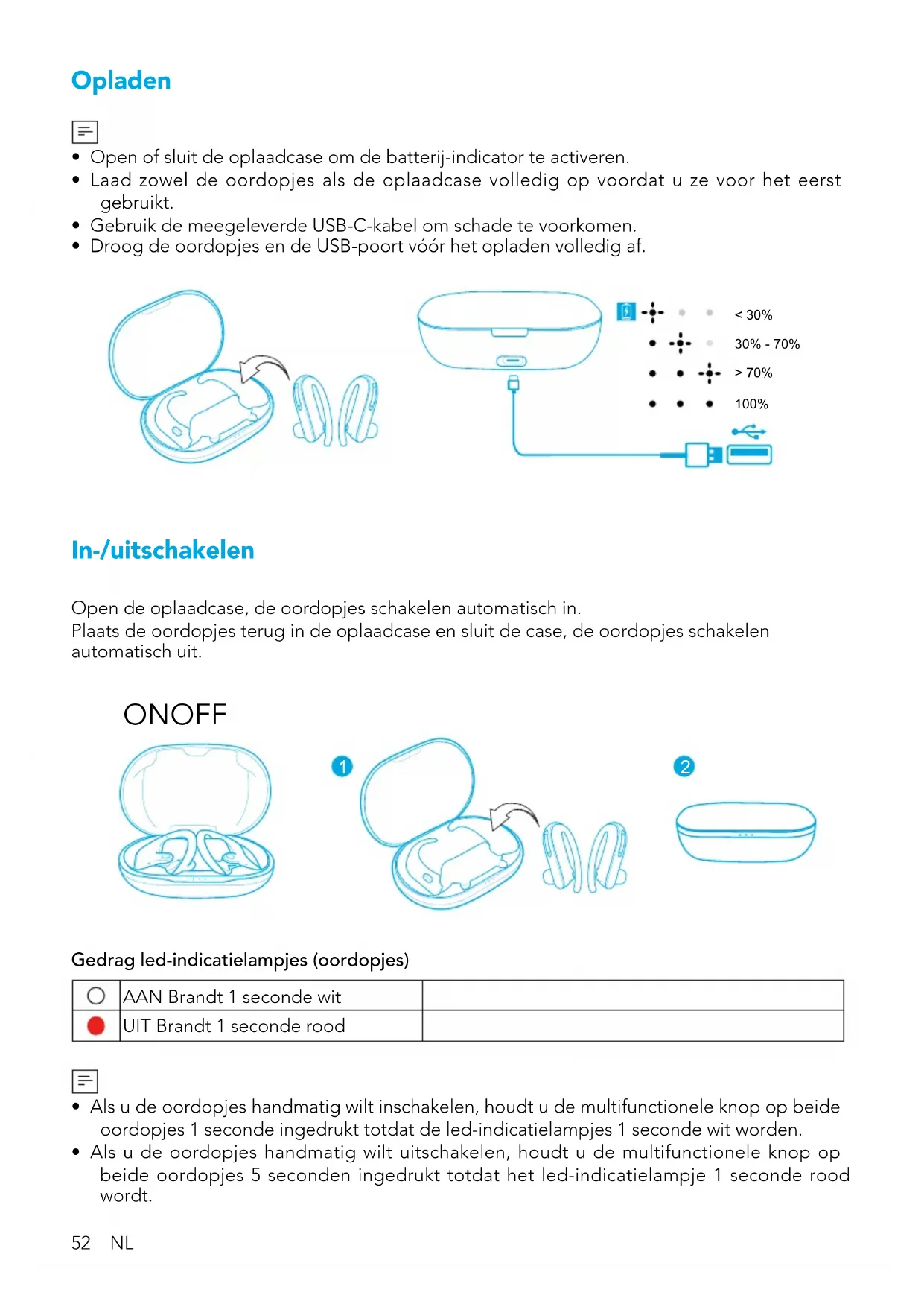 - Droog de oordopjes en de USB-poort vóór het opladen volledig af. < 30% 30% - 70% > 70% 100% In-/uitschakelen Open de oplaadcase, de oordopjes schakelen automatisch in. Plaats de oordopjes terug in de oplaadcase en sluit de case, de oordopjes schakelen automatisch uit. ON OFF