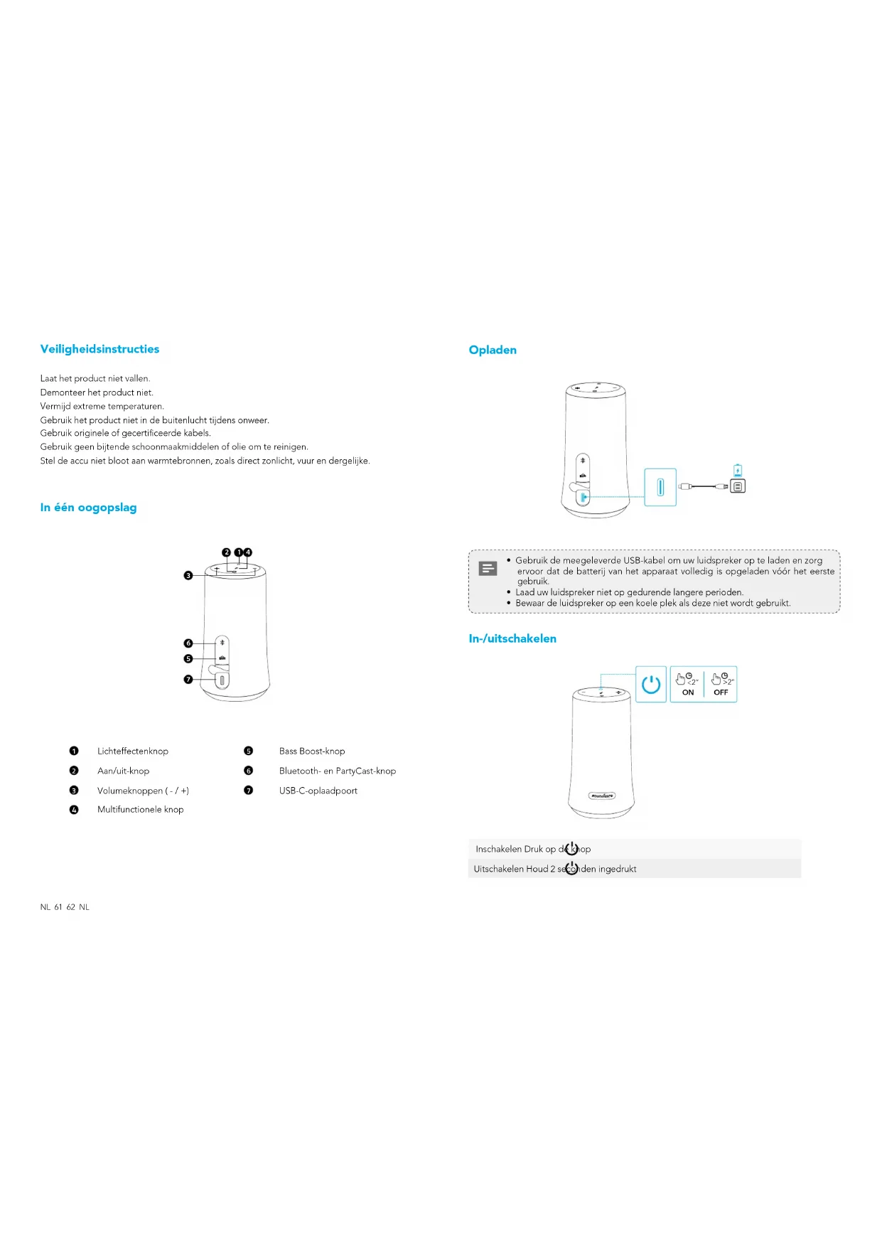 - Bewaar de luidspreker op een koele plek als deze niet wordt gebruikt. In-/uitschakelen