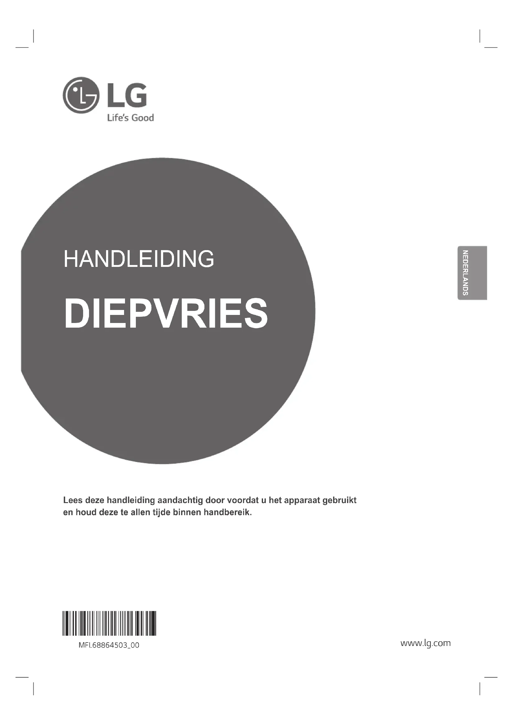 - Pour éliminer le bruit, s'assurer que les côtés et l'arrière ne puissent pas vibrer contre un mur ou un meuble.Notewww.lg.com HANDLEIDING DIEPVRIES Lees deze handleiding aandachtig door voordat u het apparaat gebruikt en houd deze te allen tijde binnen handbereik. MFL68864503_00 NEDERLANDSiNhouDsopgave Deze handleiding is gemaakt voor een groep producten en kan afbeeldingen of inhoud bevatten die afwijken van het model dat u hebt gekocht. Deze handleiding is onderhevig aan herziening door de fabrikant. veiLigheiDsvoorschrifteN p. 3