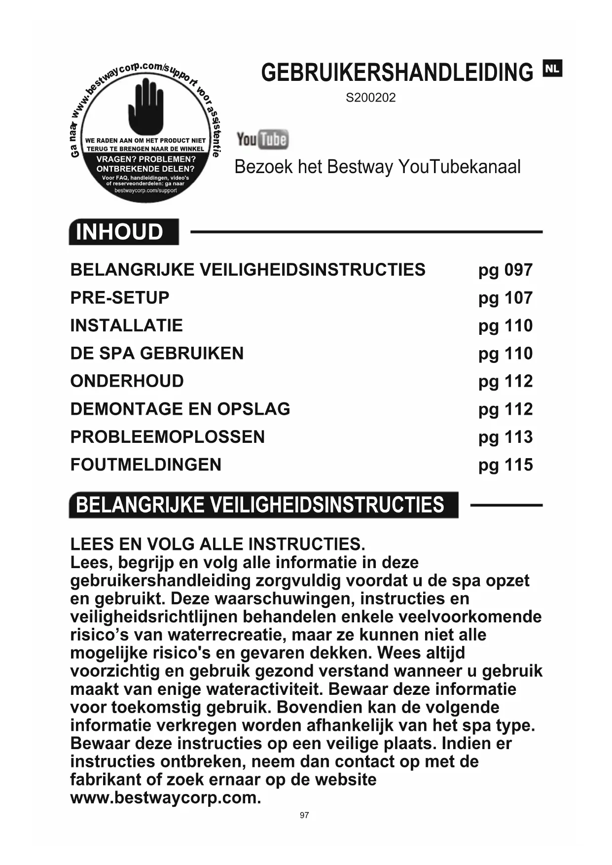 S200202LEES EN VOLG ALLE INSTRUCTIES. Lees, begrijp en volg alle informatie in deze gebruikershandleiding zorgvuldig voordat u de spa opzet en gebruikt. Deze waarschuwingen, instructies en veiligheidsrichtlijnen behandelen enkele veelvoorkomende risico’s van waterrecreatie, maar ze kunnen niet alle mogelijke risico's en gevaren dekken. Wees altijd voorzichtig en gebruik gezond verstand wanneer u gebruik maakt van enige wateractiviteit. Bewaar deze informatie voor toekomstig gebruik. Bovendien kan de volgende informatie verkregen worden afhankelijk van het spa type. Bewaar deze instructies op een veilige plaats. Indien er instructies ontbreken, neem dan contact op met de fabrikant of zoek ernaar op de website www.bestwaycorp.com. WAARSCHUWINGEN – VEILIGHEIDSINSTALLATIE