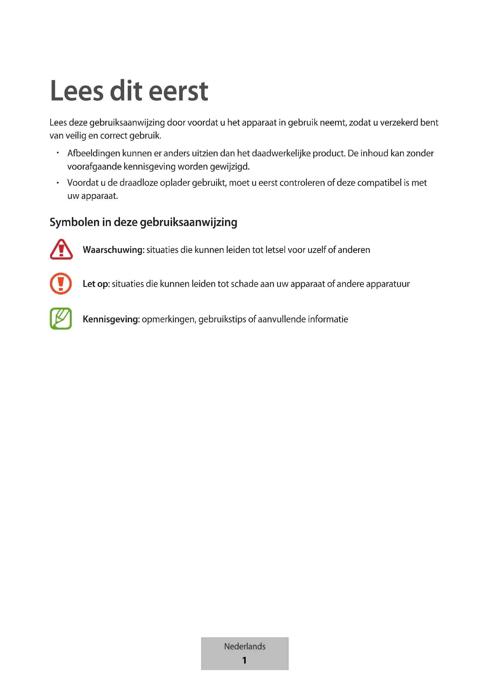 Voordat u de draadloze oplader gebruikt, moet u eerst controleren of deze compatibel is met uw apparaat. Symbolen in deze gebruiksaanwijzing Waarschuwing: situaties die kunnen leiden tot letsel voor uzelf of anderen Let op: situaties die kunnen leiden tot schade aan uw apparaat of andere apparatuur Kennisgeving: opmerkingen, gebruikstips of aanvullende informatie Nederlands