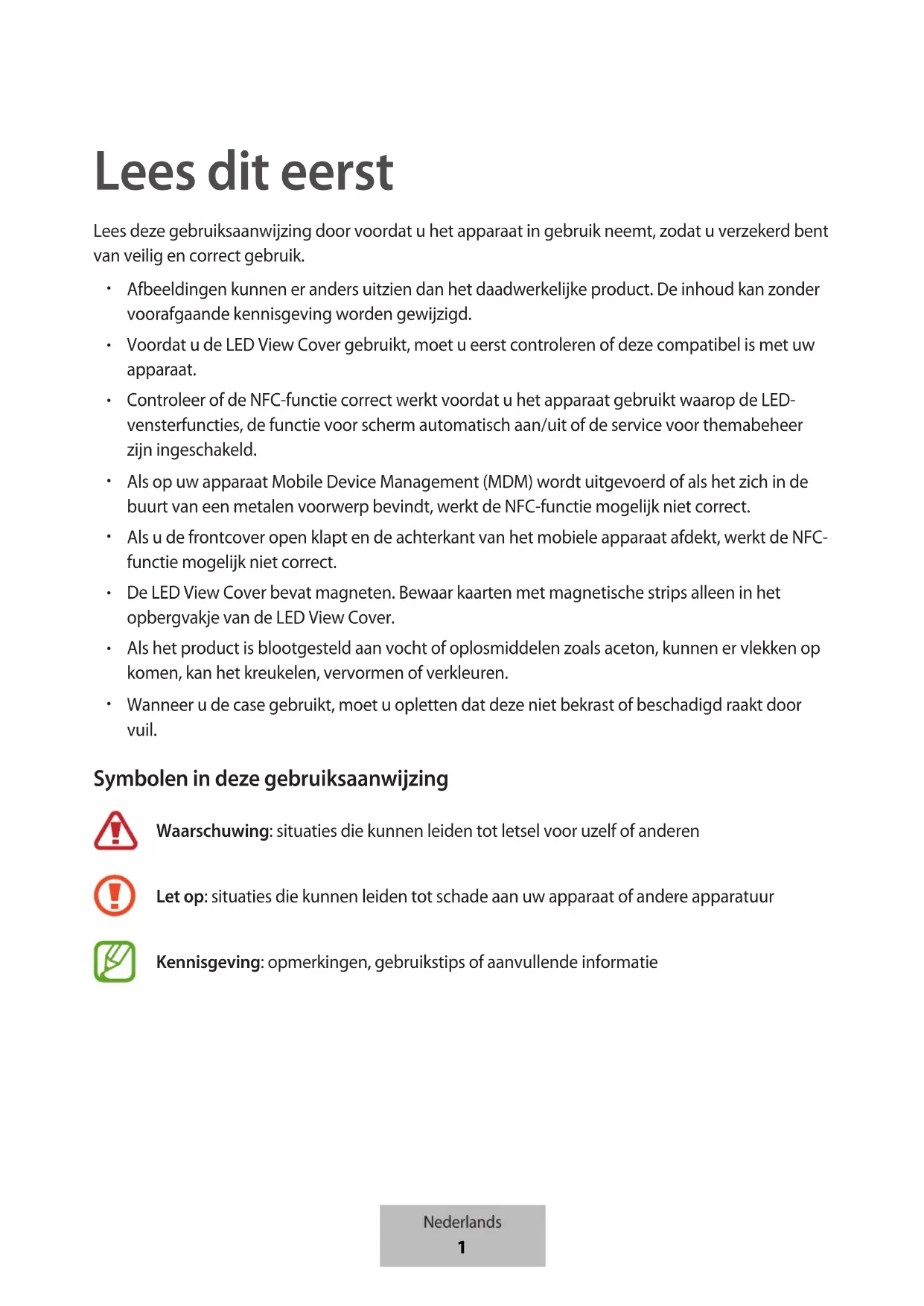 Accessoires en gebruik vervolgens de editor-functie voor LED-pictogrammen. U kunt ook de editor-app voor LED-pictogrammen gebruiken die wordt weergegeven wanneer u de LED View Cover bevestigt aan het mobiele apparaat. Nederlands 5Drukfouten voorbehouden. Copyright Copyright © 2020 Samsung Electronics Co., Ltd. Deze gebruiksaanwijzing is beschermd onder internationale auteursrechtwetten. Geen enkel onderdeel van deze gebruiksaanwijzing mag worden gereproduceerd, gedistribueerd, vertaald of verzonden in welke vorm dan ook of op welke elektronische of mechanische wijze dan ook, inclusief door deze te fotokopiëren, op te nemen of op te slaan in een systeem voor het opslaan en ophalen van informatie. Handelsmerken