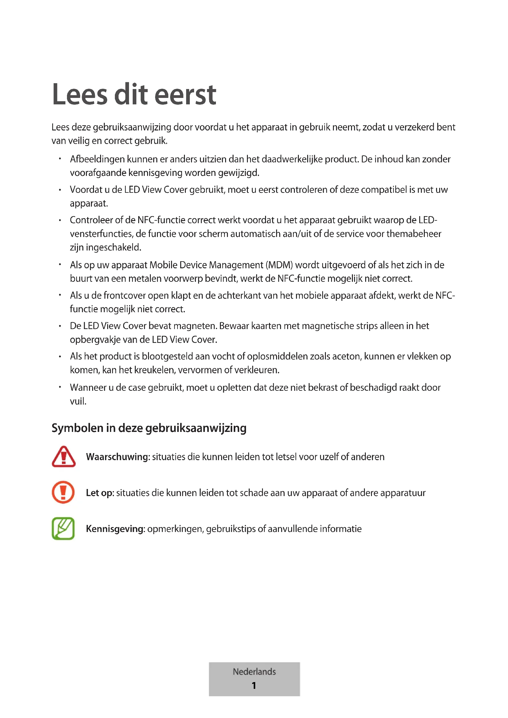 Wanneer u de case gebruikt, moet u opletten dat deze niet bekrast of beschadigd raakt door vuil. Symbolen in deze gebruiksaanwijzing Waarschuwing: situaties die kunnen leiden tot letsel voor uzelf of anderen Let op: situaties die kunnen leiden tot schade aan uw apparaat of andere apparatuur Kennisgeving: opmerkingen, gebruikstips of aanvullende informatie Nederlands