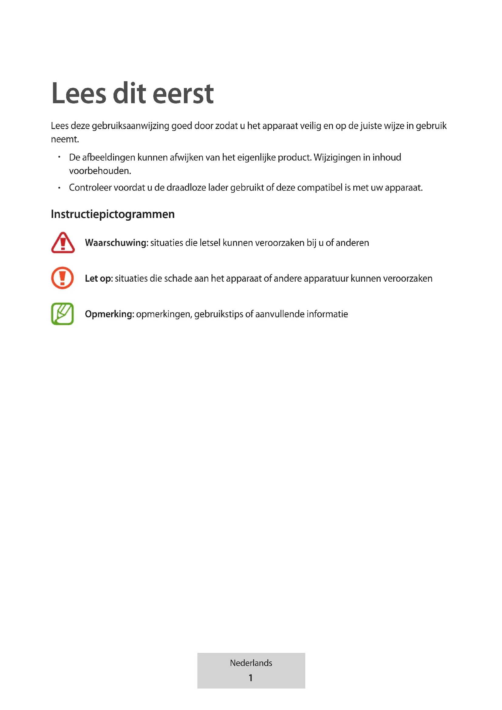 Het controlelampje werkt mogelijk anders, afhankelijk van het mobiele apparaat of de draadloze oplaadcover.10 Nederlands Drukfouten voorbehouden. Auteursrecht Auteursrecht © 2020 Samsung Electronics Co., Ltd. Deze handleiding wordt beschermd door internationale auteursrechtwetgeving. Geen enkel onderdeel van deze gebruiksaanwijzing mag worden gereproduceerd, gedistribueerd, vertaald of verzonden in welke vorm dan ook of op welke elektronische of mechanische wijze dan ook, inclusief door deze te fotokopiëren, op te nemen of op te slaan in een systeem voor het opslaan en ophalen van informatie. Handelsmerken