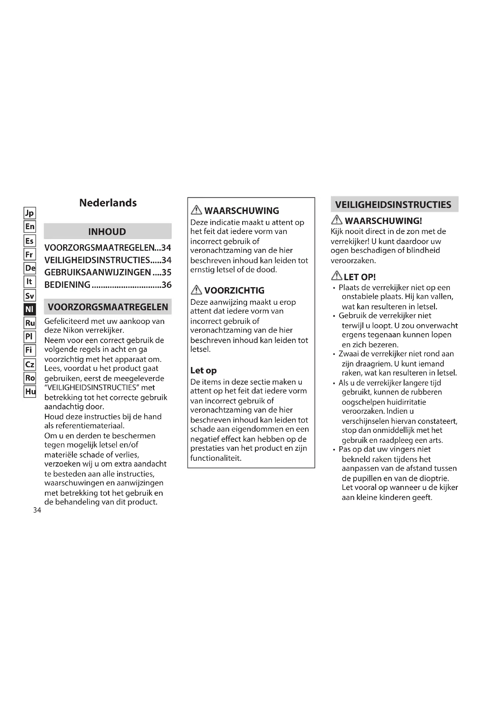 Stel de verrekijker Niet bloot aan fysieke schokken. Als de verrekijker een sterke schok ondergaat of als u deze LAST vallen en het beeld daarna nicht normal is, of als deze worden ondergedompeld in water, neem dan onmiddelijk contact op met de dealer waar u de verrekijker hebt gekocht of met een door Nikon erkende servicevertegenwoordiger.
