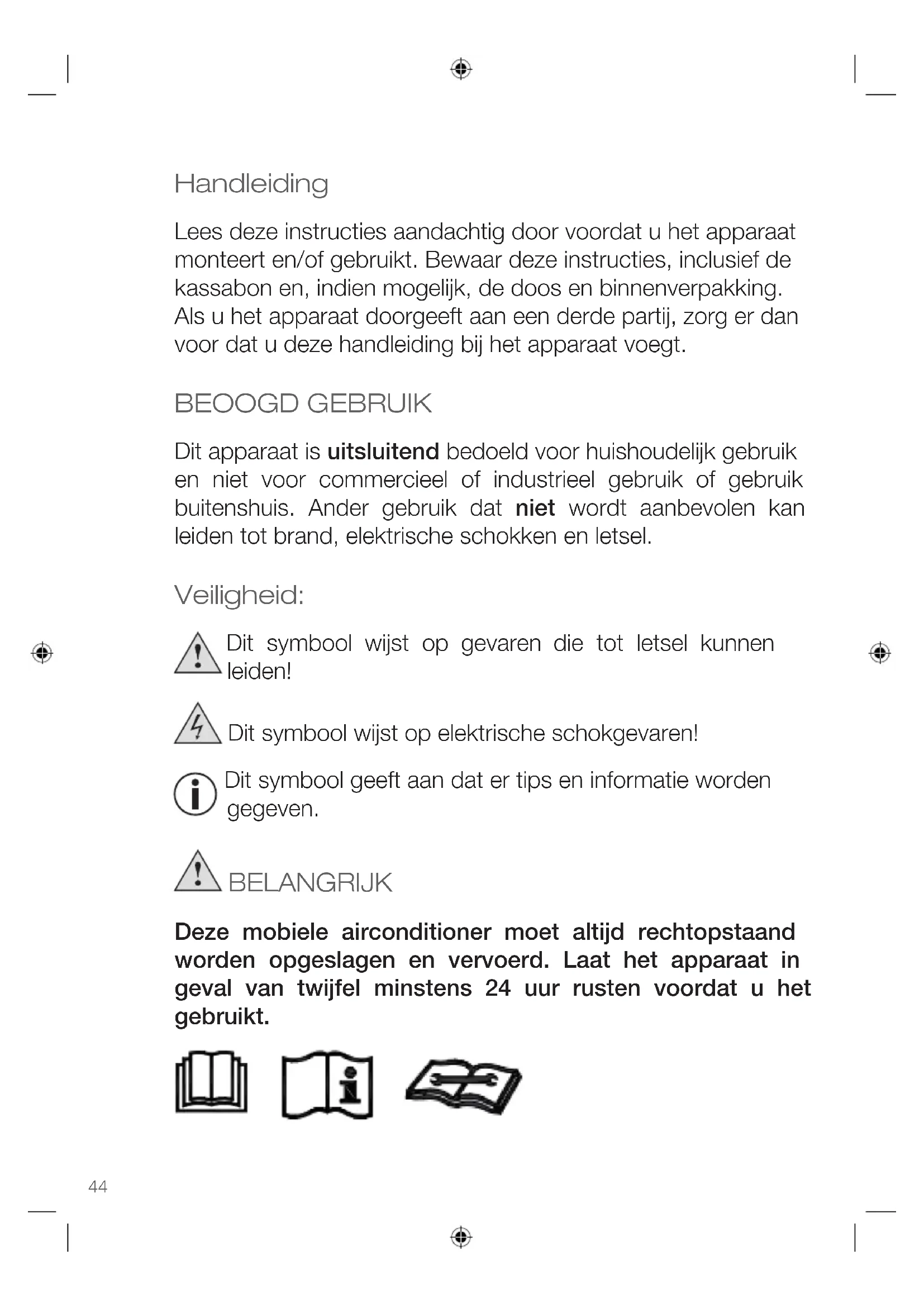 - fordamagescausedbyowner This guarantee does not affect your statutory right, nor any legal right you may have as a custumer under applicable national legislation governing the purchase of goods. In order to assert his/her right in a guarantee case during the guaranteed period, the customer must provide evidence of the date of purchase (receipt). The guarantee is to be asserted against KORONA electric GmbH, Sundern/Germany. Telephone Hotline: +49 2933 90284-80 Mail: service@korona-electric.de web: www.korona-electric.de within 2 years after the date of purchase. In case of guarantee the customer is given the right to get the appliance repaired at our own or at an authorized shop. Further rights (due to guarantee case) are not given to the customer.44 Handleiding Lees deze instructies aandachtig door voordat u het apparaat monteert en/of gebruikt. Bewaar deze instructies, inclusief de kassabon en, indien mogelijk, de doos en binnenverpakking. Als u het apparaat doorgeeft aan een derde partij, zorg er dan voor dat u deze handleiding bij het apparaat voegt. BEOOGD GEBRUIK Dit apparaat is uitsluitend bedoeld voor huishoudelijk gebruik en niet voor commercieel of industrieel gebruik of gebruik buitenshuis. Ander gebruik dat niet wordt aanbevolen kan leiden tot brand, elektrische schokken en letsel. Veiligheid: Dit symbool wijst op gevaren die tot letsel kunnen leiden! Dit symbool wijst op elektrische schokgevaren! Dit symbool geeft aan dat er tips en informatie worden gegeven. BELANGRIJK Deze mobiele airconditioner moet altijd rechtopstaand worden opgeslagen en vervoerd. Laat het apparaat in geval van twijfel minstens 24 uur rusten voordat u het gebruikt.NEDERLANDS Handleiding