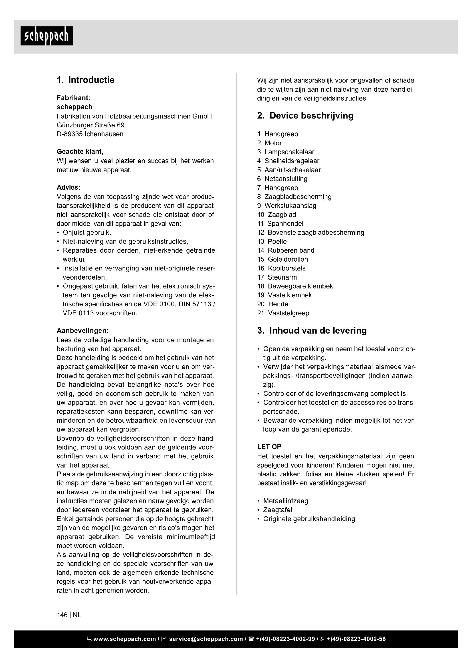 Fabrikant: scheppach Fabrikation von Holzbearbeitungsmaschinen GmbH Günzburger Straße 69 D-89335 Ichenhausen Geachte klant, Wij wensen u veel plezier en succes bij het werken met uw nieuwe apparaat. Advies: Volgens de van toepassing zijnde wet voor produc- taansprakelijkheid is de producent van dit apparaat niet aansprakelijk voor schade die ontstaat door of door middel van dit apparaat in geval van: