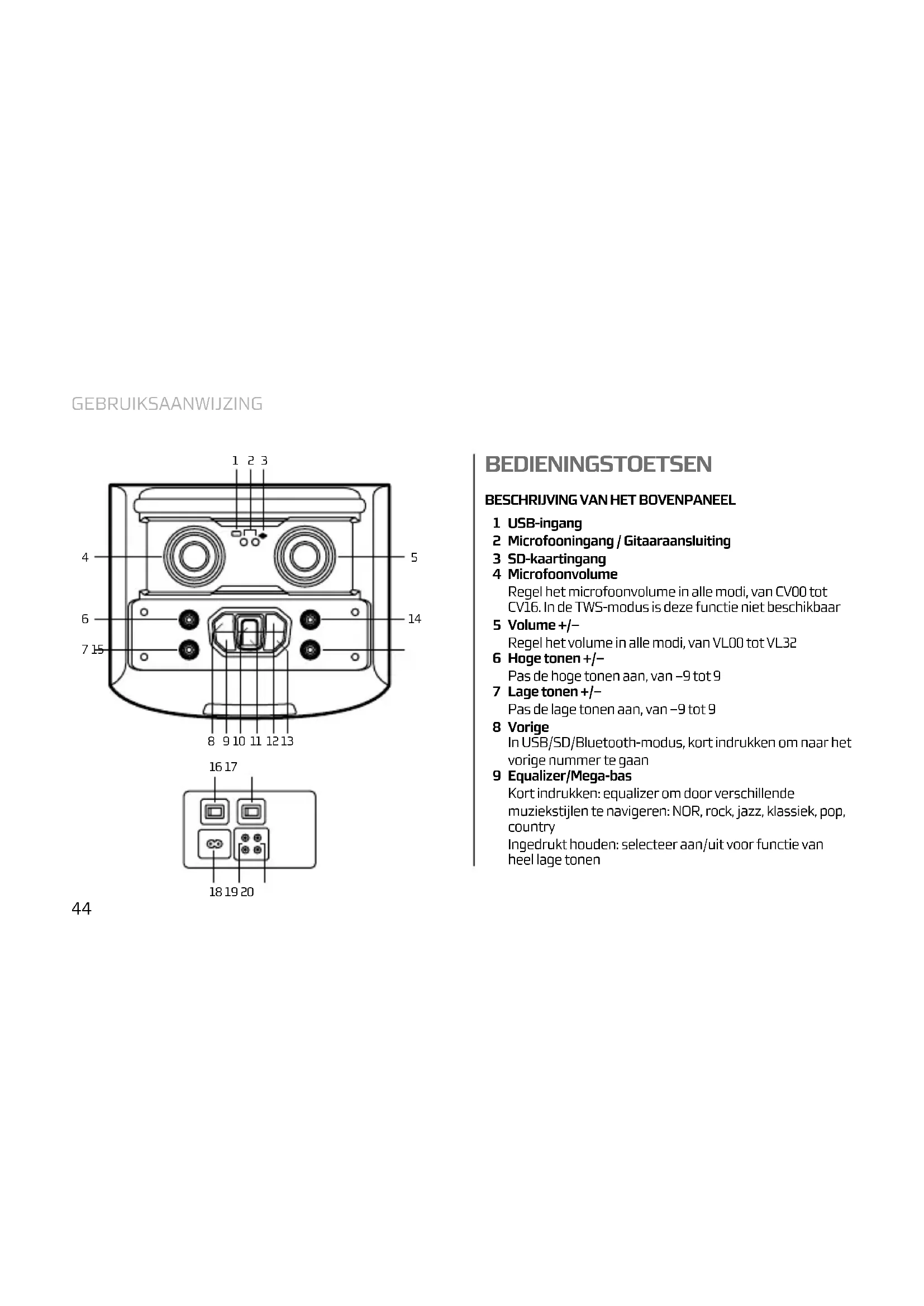 USB-ingang Microfooningang / Gitaaraansluiting SD-kaartingang Microfoonvolume Regel het microfoonvolume in alle modi, van CV00 tot CV16. In de TWS-modus is deze functie niet beschikbaar Volume +/– Regel het volume in alle modi, van VL00 tot VL32 Hoge tonen +/– Pas de hoge tonen aan, van –9 tot 9 Lage tonen +/– Pas de lage tonen aan, van –9 tot 9 Vorige In USB/SD/Bluetooth-modus, kort indrukken om naar het vorige nummer te gaan Equalizer/Mega-bas Kort indrukken: equalizer om door verschillende muziekstijlen te navigeren: NOR, rock, jazz, klassiek, pop, country Ingedrukt houden: selecteer aan/uit voor functie van heel lage tonen