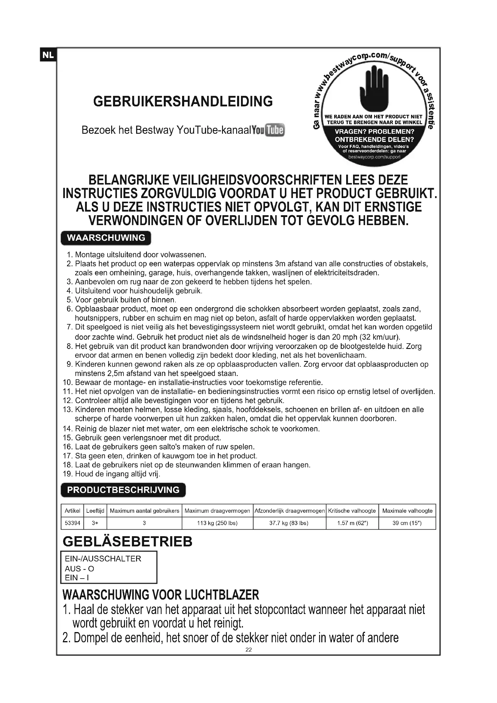 KORJAUSPAIKKAOHJEET VIANETSINTÄ ONGELMA URSACHEMoottori ei käynnistyMoottori käy, mutta pyörästä kuuluu hankaava ääni.1. Kytkin ei ole päällä.2. Virtapiiri ei ole kytketty tai sen kosketus on heikko.3. Virtakapasiteetti on viallinen.4. Kova esine on aiheuttaneet tukkeutumisen.1. Siipipyörän ruuvit ovat irrallaan.2. Ilmanpuhaltimessa on vieraita esineitä.1. Jännite ei ole vakaa.2. Moottoriin on tullut höyryä.3. Virtakapasiteetti on viallinen.4. Juoksupyörä on irti.Moottori ei käynnisty normaalistiBELANGRIJKE VEILIGHEIDSVOORSCHRIFTEN LEES DEZE INSTRUCTIES ZORGVULDIG VOORDAT U HET PRODUCT GEBRUIKT. ALS U DEZE INSTRUCTIES NIET OPVOLGT, KAN DIT ERNSTIGE VERWONDINGEN OF OVERLIJDEN TOT GEVOLG HEBBEN. 1. Montage uitsluitend door volwassenen. 2. Plaats het product op een waterpas oppervlak op minstens 3m afstand van alle constructies of obstakels, zoals een omheining, garage, huis, overhangende takken, waslijnen of elektriciteitsdraden. 3. Aanbevolen om rug naar de zon gekeerd te hebben tijdens het spelen. 4. Uitsluitend voor huishoudelijk gebruik. 5. Voor gebruik buiten of binnen. 6. Opblaasbaar product, moet op een ondergrond die schokken absorbeert worden geplaatst, zoals zand, houtsnippers, rubber en schuim en mag niet op beton, asfalt of harde oppervlakken worden geplaatst. 7. Dit speelgoed is niet veilig als het bevestigingssysteem niet wordt gebruikt, omdat het kan worden opgetild door zachte wind. Gebruik het product niet als de windsnelheid hoger is dan 20 mph (32 km/uur). 8. Het gebruik van dit product kan brandwonden door wrijving veroorzaken op de blootgestelde huid. Zorg ervoor dat armen en benen volledig zijn bedekt door kleding, net als het bovenlichaam. 9. Kinderen kunnen gewond raken als ze op opblaasproducten vallen. Zorg ervoor dat opblaasproducten op minstens 2,5m afstand van het speelgoed staan.10. Bewaar de montage- en installatie-instructies voor toekomstige referentie.11. Het niet opvolgen van de installatie- en bedieningsinstructies vormt een risico op ernstig letsel of overlijden.12. Controleer altijd alle bevestigingen voor en tijdens het gebruik.13. Kinderen moeten helmen, losse kleding, sjaals, hoofddeksels, schoenen en brillen af- en uitdoen en alle scherpe of harde voorwerpen uit hun zakken halen, omdat die het oppervlak kunnen doorboren.14. Reinig de blazer niet met water, om een elektrische schok te voorkomen.15. Gebruik geen verlengsnoer met dit product.16. Laat de gebruikers geen salto's maken of ruw spelen.17. Sta geen eten, drinken of kauwgom toe in het product.18. Laat de gebruikers niet op de steunwanden klimmen of eraan hangen.19. Houd de ingang altijd vrij. PRODUCTBESCHRIJVING WAARSCHUWING Artikel53394Leeftijd Maximum aantal gebruikers Maximum draagvermogen113 kg (250 lbs)Afzonderlijk draagvermogen37.7 kg (83 lbs)Kritische valhoogte1.57 m (62″)Maximale valhoogte39 cm (15″)