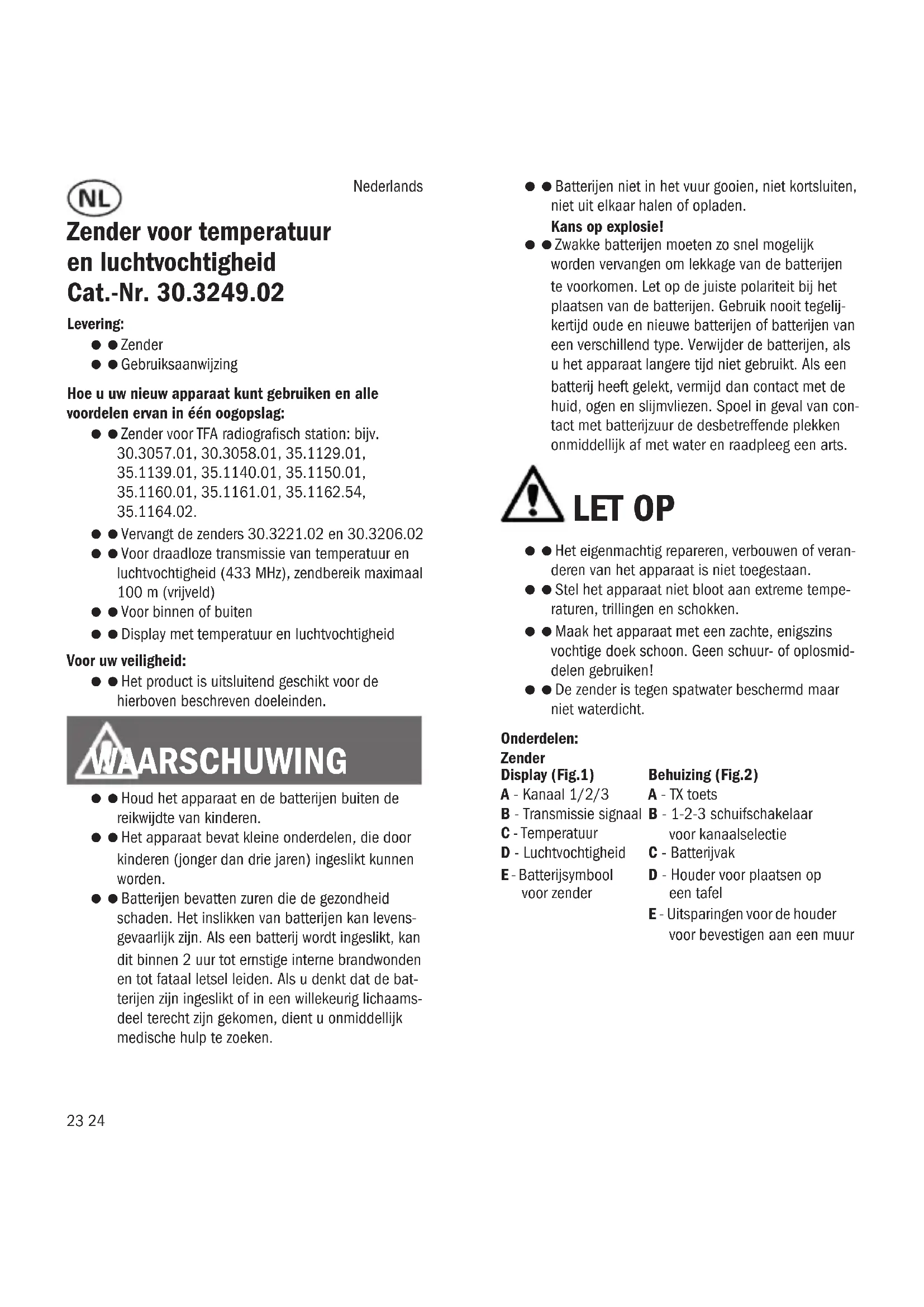 Vervangt de zenders 30.3221.02 en 30.3206.02 Voor draadloze transmissie van temperatuur en luchtvochtigheid (433 MHz), zendbereik maximaal 100 m (vrijveld) Voor binnen of buiten Display met temperatuur en luchtvochtigheid Voor uw veiligheid: Het product is uitsluitend geschikt voor de hierboven beschreven doeleinden. WAARSCHUWING Houd het apparaat en de batterijen buiten de reikwijdte van kinderen. Het apparaat bevat kleine onderdelen, die door kinderen (jonger dan drie jaren) ingeslikt kunnen worden. Batterijen bevatten zuren die de gezondheid schaden. Het inslikken van batterijen kan levens- gevaarlijk zijn. Als een batterij wordt ingeslikt, kan dit binnen 2 uur tot ernstige interne brandwonden en tot fataal letsel leiden. Als u denkt dat de bat- terijen zijn ingeslikt of in een willekeurig lichaams- deel terecht zijn gekomen, dient u onmiddellijk medische hulp te zoeken. Batterijen niet in het vuur gooien, niet kortsluiten, niet uit elkaar halen of opladen. Kans op explosie! Zwakke batterijen moeten zo snel mogelijk worden vervangen om lekkage van de batterijen te voorkomen. Let op de juiste polariteit bij het plaatsen van de batterijen. Gebruik nooit tegelij- kertijd oude en nieuwe batterijen of batterijen van een verschillend type. Verwijder de batterijen, als u het apparaat langere tijd niet gebruikt. Als een batterij heeft gelekt, vermijd dan contact met de huid, ogen en slijmvliezen. Spoel in geval van con- tact met batterijzuur de desbetreffende plekken onmiddellijk af met water en raadpleeg een arts. LET OP Het eigenmachtig repareren, verbouwen of veran- deren van het apparaat is niet toegestaan. Stel het apparaat niet bloot aan extreme tempe- raturen, trillingen en schokken. Maak het apparaat met een zachte, enigszins vochtige doek schoon. Geen schuur- of oplosmid- delen gebruiken! De zender is tegen spatwater beschermd maar niet waterdicht. Onderdelen: Zender Display (Fig.1) A - Kanaal 1/2/3 B - Transmissie signaal C - Temperatuur D - Luchtvochtigheid E - Batterijsymbool voor zender