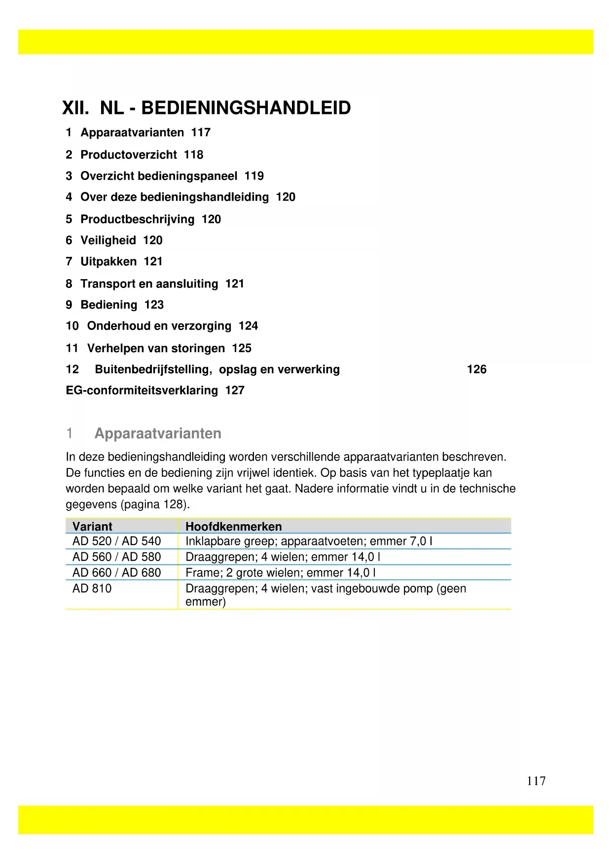 1 Apparaatvarianten 117 2 Productoverzicht 118 3 Overzicht bedieningspaneel 119 4 Over deze bedieningshandleiding 120 5 Productbeschrijving 120 6 Veiligheid 120 7 Uitpakken 121 8 Transport en aansluiting 121 9 Bediening 123 10 Onderhoud en verzorging 124 11 Verhelpen van storingen 125 12 Buitenbedrijfstelling, opslag en verwerking 126 EG-conformiteitsverklaring 127 1 Apparaatvarianten In deze bedieningshandleiding worden verschillende apparaatvarianten beschreven. De functies en de bediening zijn vrijwel identiek. Op basis van het typeplaatje kan worden bepaald om welke variant het gaat. Nadere informatie vindt u in de technische gegevens (pagina 128). Variant Hoofdkenmerken AD 520 / AD 540 Inklapbare greep; apparaatvoeten; emmer 7,0 l AD 560 / AD 580 Draaggrepen; 4 wielen; emmer 14,0 l AD 660 / AD 680 Frame; 2 grote wielen; emmer 14,0 l AD 810 Draaggrepen; 4 wielen; vast ingebouwde pomp (geen emmer)118 2 Productoverzicht