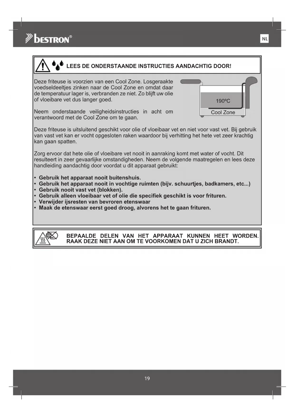 Deze friteuse is voorzien van een Cool Zone. Losgeraakte voedseldeeltjes zinken naar de Cool Zone en omdat daar de temperatuur lager is, verbranden ze niet. Zo blijft uw olie of vloeibare vet dus langer goed. Neem onderstaande veiligheidsinstructies in acht om verantwoord met de Cool Zone om te gaan. Deze friteuse is uitsluitend geschikt voor olie of vloeibaar vet en niet voor vast vet. Bij gebruik van vast vet kan er vocht opgesloten raken waardoor bij verhitting het hete vet zeer krachtig kan gaan spatten. Zorg ervoor dat hete olie of vloeibare vet nooit in aanraking komt met water of vocht. Dit resulteert in zeer gevaarlijke omstandigheden. Neem de volgende maatregelen en lees deze handleiding aandachtig door voordat u dit apparaat gebruikt: