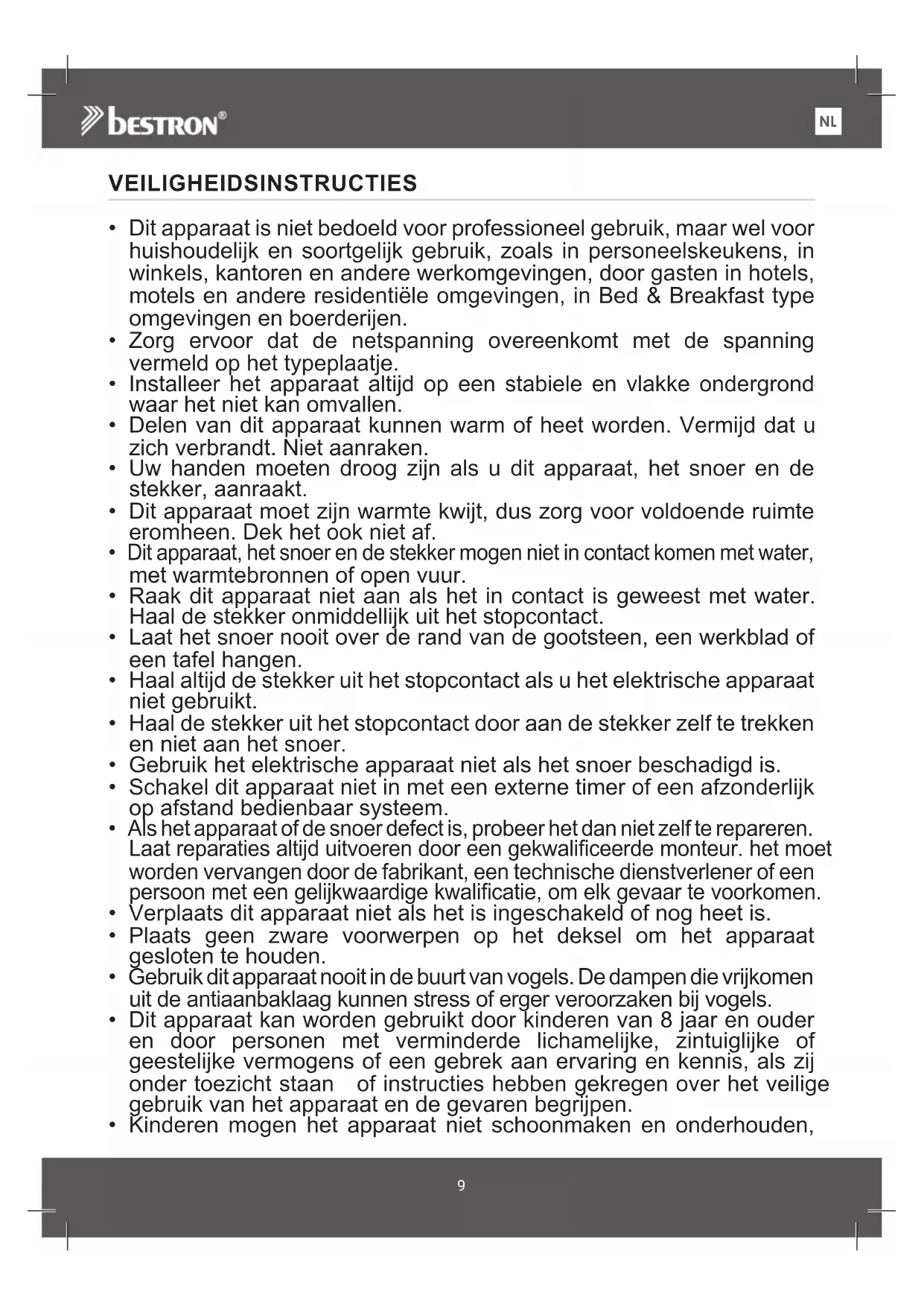 - Gebruik dit apparaat nooit in de buurt van vogels. De dampen die vrijkomenuit de antjaanbaklaag kunnen stress of erger peroorzaken bij vogels.