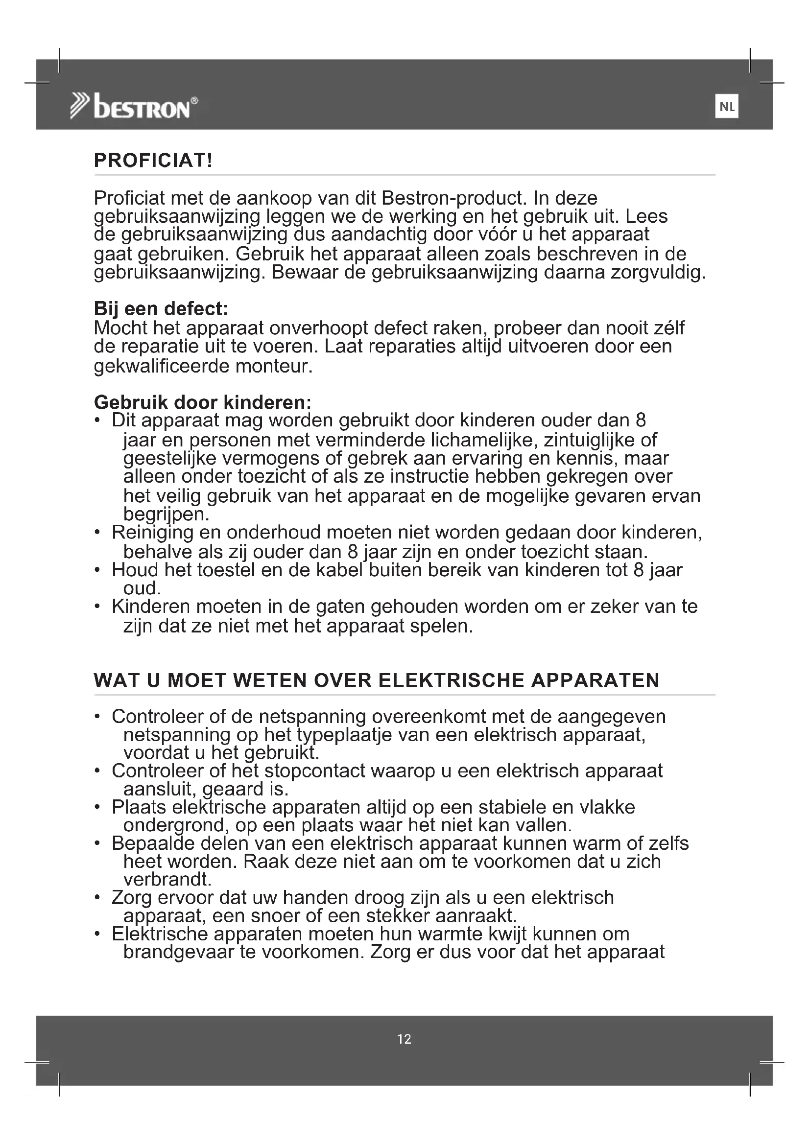 FRPROFICIAT! Proficiat met de aankoop van dit Bestron-product. In deze gebruiksaanwijzing leggen we de werking en het gebruik uit. Lees de gebruiksaanwijzing dus aandachtig door vóór u het apparaat gaat gebruiken. Gebruik het apparaat alleen zoals beschreven in de gebruiksaanwijzing. Bewaar de gebruiksaanwijzing daarna zorgvuldig. Bij een defect: Mocht het apparaat onverhoopt defect raken, probeer dan nooit zélf de reparatie uit te voeren. Laat reparaties altijd uitvoeren door een gekwalificeerde monteur. Gebruik door kinderen: