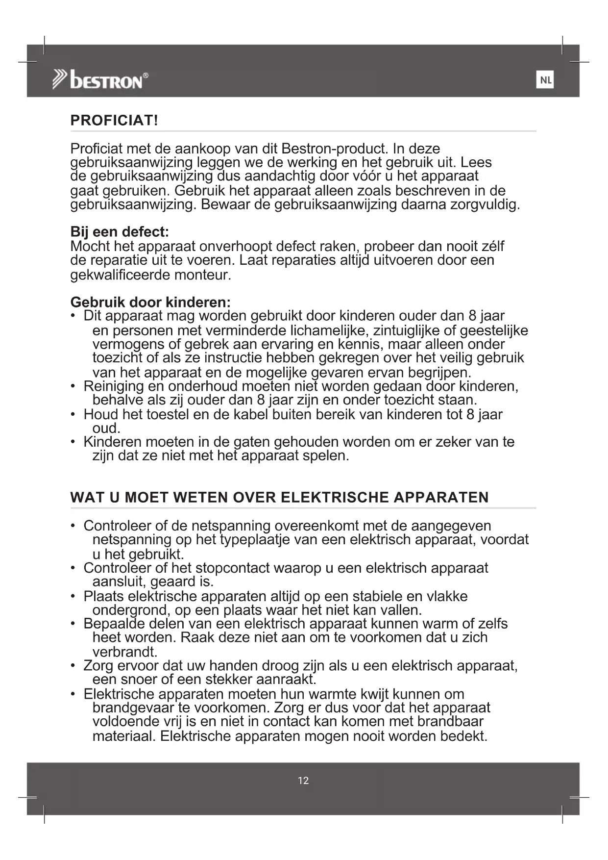 PROFICIAT! Proficiat met de aankoop van dit Bestron-product. In deze gebruiksaanwijzing leggen we de werking en het gebruik uit. Lees de gebruiksaanwijzing dus aandachtig door vóór u het apparaat gaat gebruiken. Gebruik het apparaat alleen zoals beschreven in de gebruiksaanwijzing. Bewaar de gebruiksaanwijzing daarna zorgvuldig. Bij een defect: Mocht het apparaat onverhoopt defect raken, probeer dan nooit zélf de reparatie uit te voeren. Laat reparaties altijd uitvoeren door een gekwalificeerde monteur. Gebruik door kinderen:
