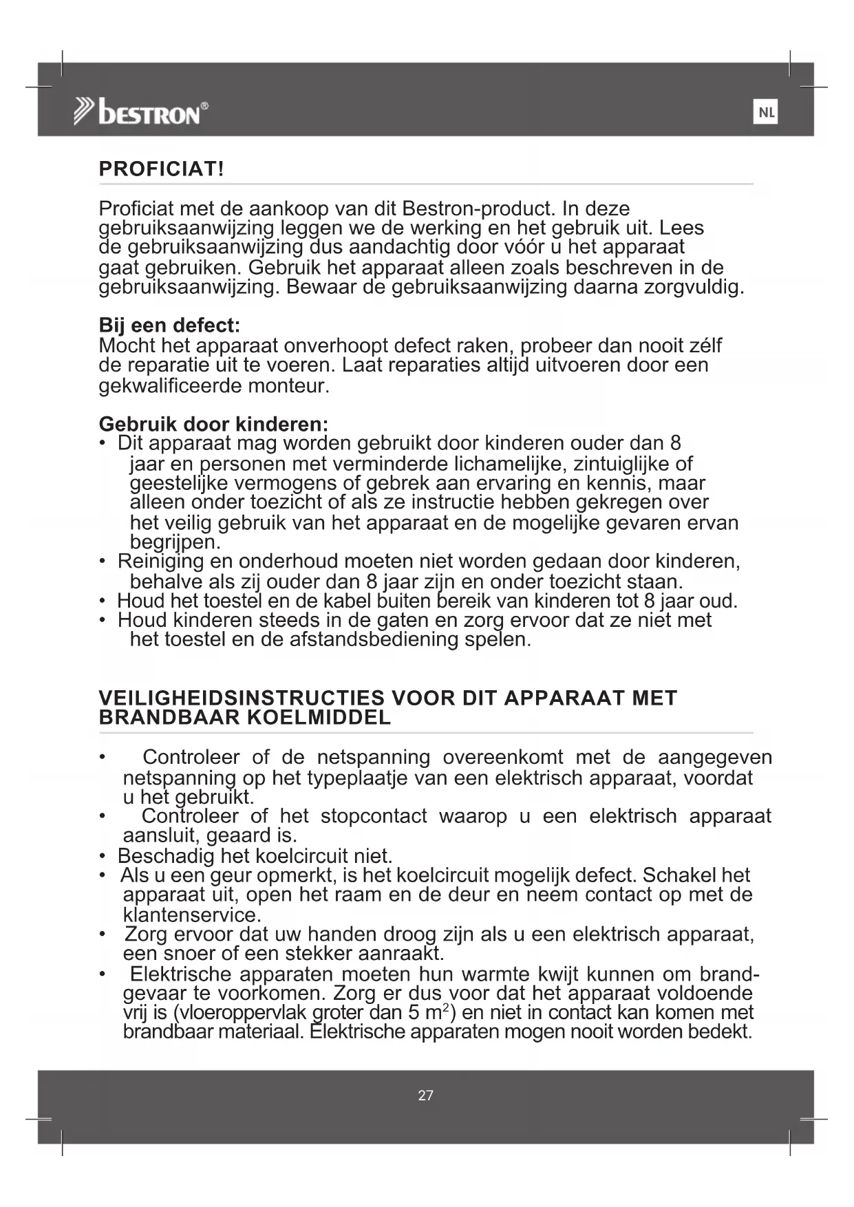 PROFICIAT! Proficiat met de aankoop van dit Bestron-product. In deze gebruiksaanwijzing leggen we de werking en het gebruik uit. Lees de gebruiksaanwijzing dus aandachtig door vóór u het apparaat gaat gebruiken. Gebruik het apparaat alleen zoals beschreven in de gebruiksaanwijzing. Bewaar de gebruiksaanwijzing daarna zorgvuldig. Bij een defect: Mocht het apparaat onverhoopt defect raken, probeer dan nooit zélf de reparatie uit te voeren. Laat reparaties altijd uitvoeren door een gekwalificeerde monteur. Gebruik door kinderen: