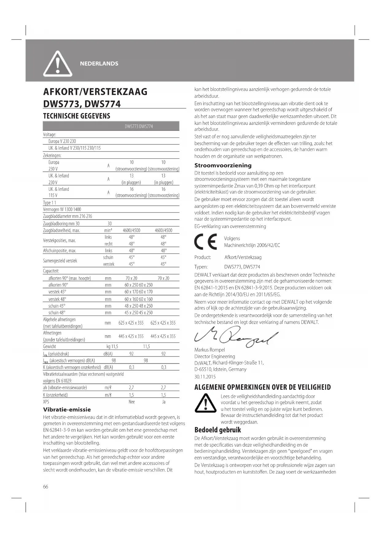 1,5 1,5 XPS Nee Ja Vibratie-emissie Het vibratie-emissieniveau dat in dit informatieblad wordt gegeven, is gemeten in overeenstemming met een gestandaardiseerde test volgens EN 62841-3-9 en kan worden gebruikt om het ene gereedschap met het andere te vergelijken. Het kan worden gebruikt voor een eerste inschatting van blootstelling. Het verklaarde vibratie-emissieniveau geldt voor de hoofdtoepassingen van het gereedschap. Als het gereedschap echter voor andere toepassingen wordt gebruikt, dan wel met andere accessoires of slecht wordt onderhouden, kan de vibratie-emissie verschillen. Dit kan het blootstellingniveau aanzienlijk verhogen gedurende de totale arbeidsduur. Een inschatting van het blootstellingniveau aan vibratie dient ook te worden overwogen wanneer het gereedschap wordt uitgeschakeld of als het aan staat maar geen daadwerkelijke werkzaamheden uitvoert. Dit kan het blootstellingniveau aanzienlijk verminderen gedurende de totale arbeidsduur. Stel vast of er nog aanvullende veiligheidsmaatregelen zijn ter bescherming van de gebruiker tegen de effecten van trilling, zoals: het onderhouden van gereedschap en de accessoires, de handen warm houden en de organisatie van werkpatronen. Stroomvoorziening Dit toestel is bedoeld voor aansluiting op een stroomvoorzieningssysteem met een maximale toegestane systeemimpedantie Zmax van 0,39 Ohm op het interfacepunt (elektriciteitskast) van de stroomvoorziening van de gebruiker. De gebruiker moet ervoor zorgen dat dit toestel alleen wordt aangesloten op een elektriciteitssysteem dat aan bovenvermeld vereiste voldoet. Indien nodig kan de gebruiker het elektriciteitsbedrijf vragen naar de systeemimpedantie op het interfacepunt. EG-verklaring van overeenstemming Volgens Machinerichtlijn 2006/42/EC Product: Afkort/Verstekzaag Typen: DWS773, DWS774 DEWALT verklaart dat deze producten als beschreven onder Technische gegevens in overeenstemming zijn met de geharmoniseerde normen: EN 62841-1:2015 en EN 62841-3-9:2015. Deze producten voldoen ook aan de Richtlijn 2014/30/EU en 2011/65/EG. Neem voor meer informatie contact op met DEWALT op het volgende adres of kijk op de achterzijde van de gebruiksaanwijzing. De ondergetekende is verantwoordelijk voor de samenstelling van het technische bestand en legt deze verklaring af namens DEWALT. Markus Rompel Director Engineering DeWALT , Richard-Klinger-Straße 11, D-65510, Idstein, Germany