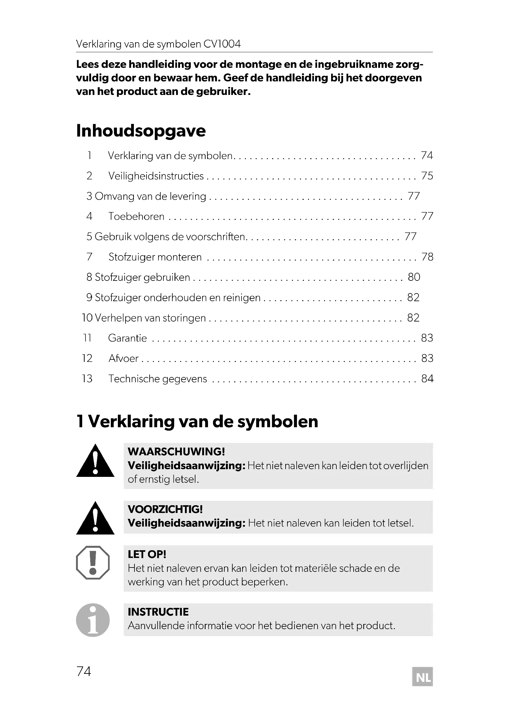 WAARSCHUWING! Veiligheidsaanwijzing: Het niet naleven kan leiden tot overlijden of ernstig letsel. VOORZICHTIG! Veiligheidsaanwijzing: Het niet naleven kan leiden tot letsel. LET OP! Het niet naleven ervan kan leiden tot materiële schade en de werking van het product beperken. INSTRUCTIE Aanvullende informatie voor het bedienen van het product. CV1004-IO-16s.book Seite 74 Dienstag, 13. Februar 2018 5:32 17NL CV1004 Veiligheidsinstructies
