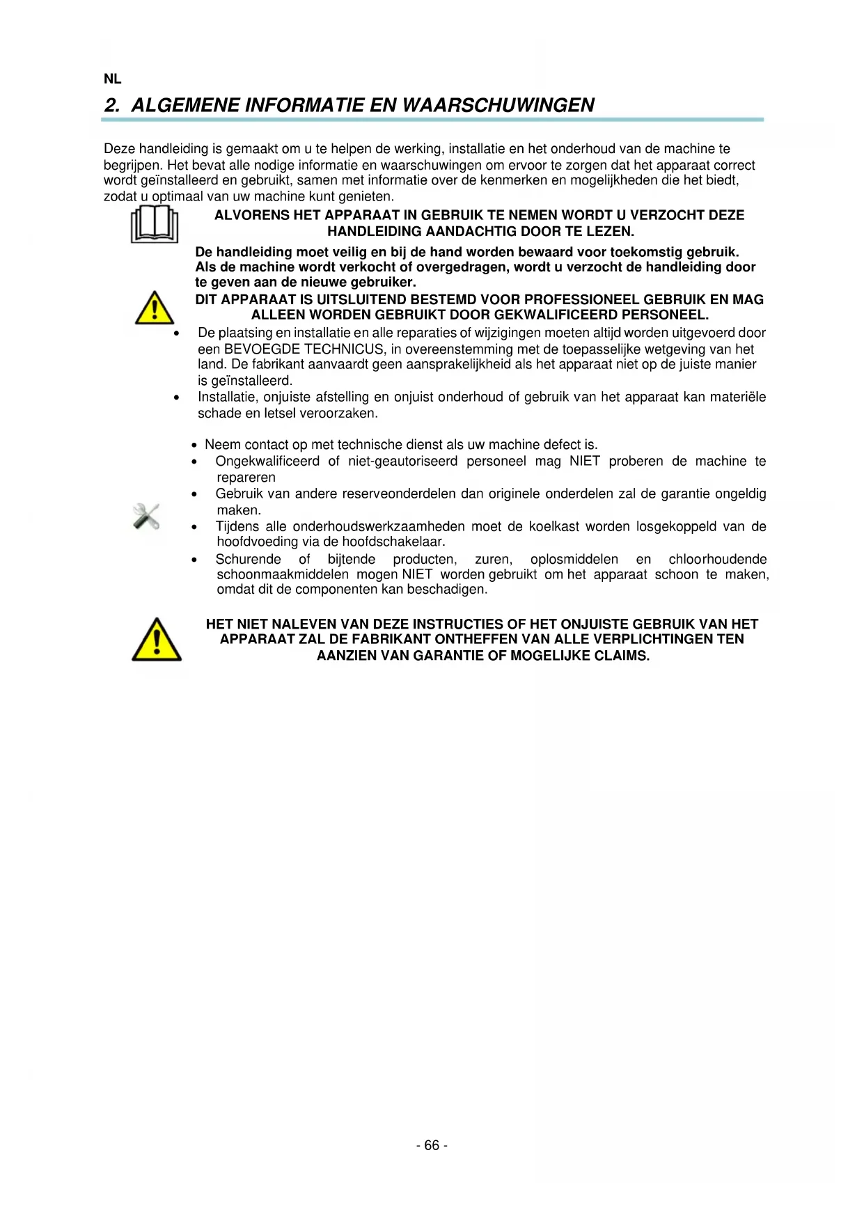HET NIET NALEVEN VAN DEZE INSTRUCTIES OF HET ONJUISTE GEBRUIK VAN HET APPARAAT ZAL DE FABRIKANT ONTHEFFEN VAN ALLE VERPLICHTINGEN TEN AANZIEN VAN GARANTIE OF MOGELIJKE CLAIMS.