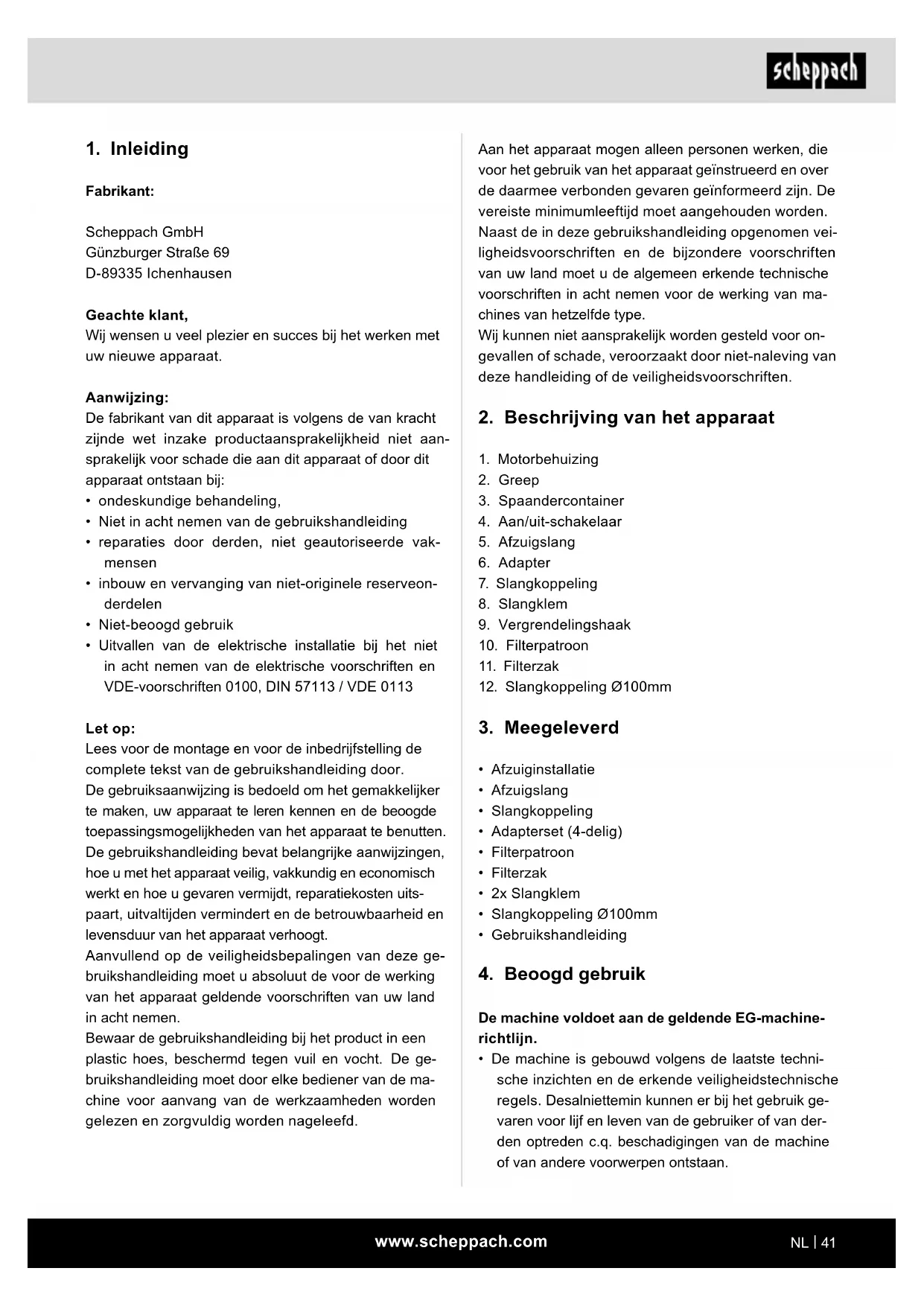 - Uitvallen van de elektrische installatie bij het niet in acht nemen van de elektrische voorschriften en VDE-voorschriften 0100, DIN 57113 / VDE 0113 Let op: Lees voor de montage en voor de inbedrijfstelling de complete tekst van de gebruikshandleiding door. De gebruiksaanwijzing is bedoeld om het gemakkelijker te maken, uw apparaat te leren kennen en de beoogde toepassingsmogelijkheden van het apparaat te benutten. De gebruikshandleiding bevat belangrijke aanwijzingen, hoe u met het apparaat veilig, vakkundig en economisch werkt en hoe u gevaren vermijdt, reparatiekosten uits- paart, uitvaltijden vermindert en de betrouwbaarheid en levensduur van het apparaat verhoogt. Aanvullend op de veiligheidsbepalingen van deze ge- bruikshandleiding moet u absoluut de voor de werking van het apparaat geldende voorschriften van uw land in acht nemen. Bewaar de gebruikshandleiding bij het product in een plastic hoes, beschermd tegen vuil en vocht. De ge- bruikshandleiding moet door elke bediener van de ma- chine voor aanvang van de werkzaamheden worden gelezen en zorgvuldig worden nageleefd.www.scheppach.com