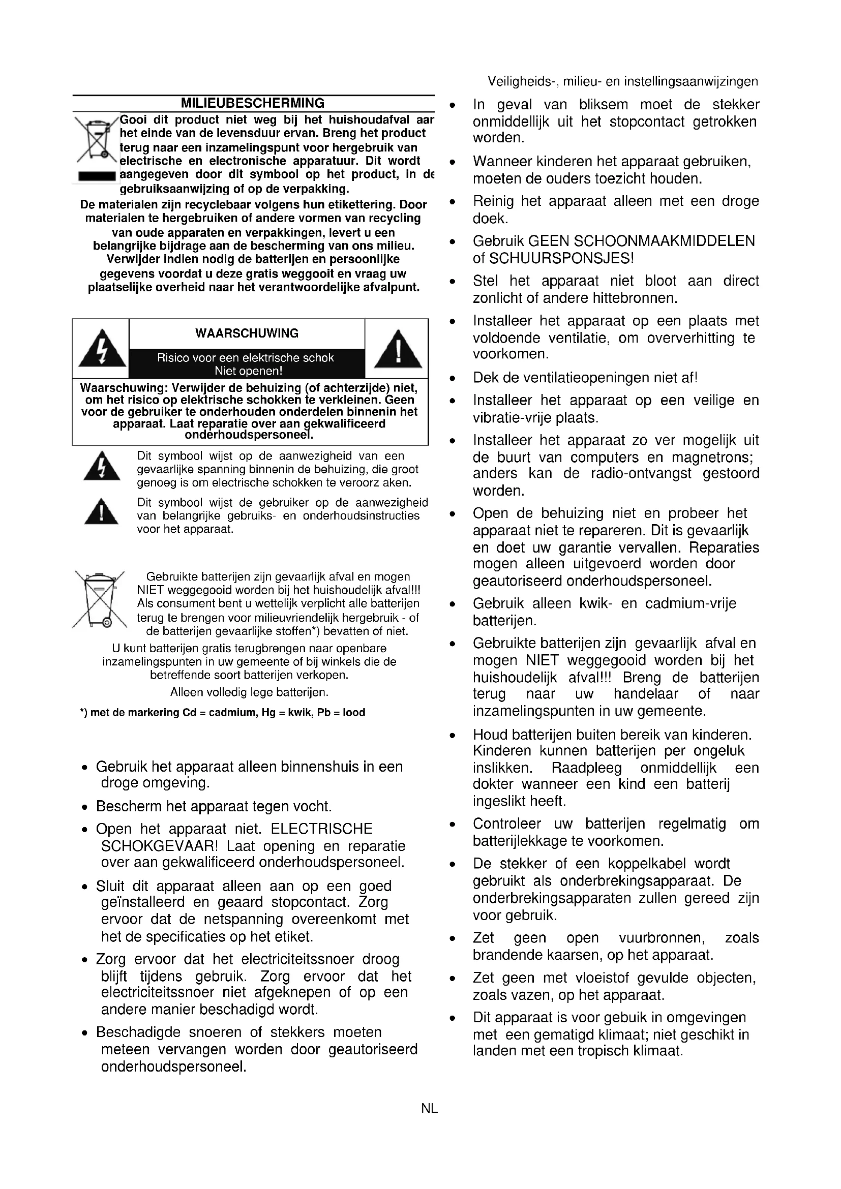 - Gebruikte batterijen zijn gevaarlijk afval en mogen NIET weggegooid worden bij het huishoudelijk afval!!! Breng de batterijen terug naar uw handelaar of naar inzamelingspunten in uw gemeente.