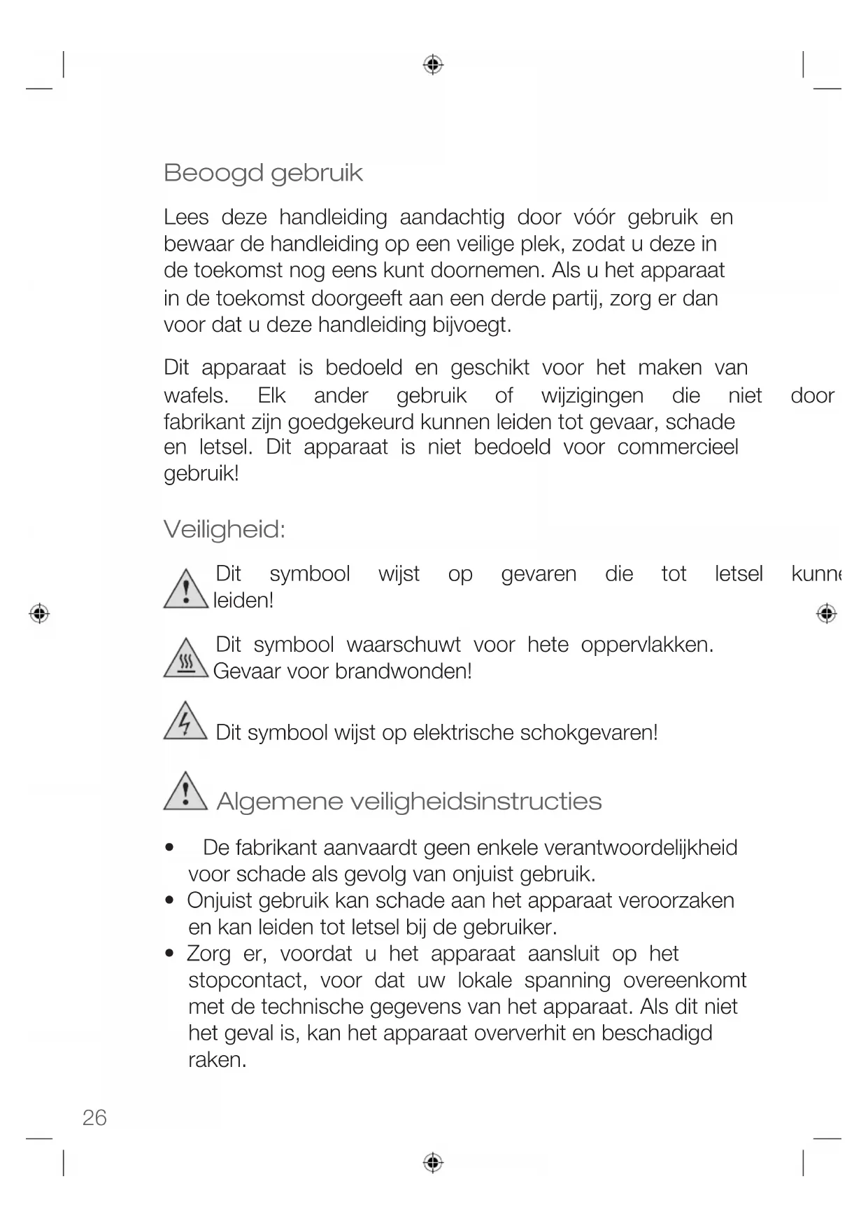 - fordamagescausedbyowner This guarantee does not affect your statutory right, nor any legal right you may have as a costumer under applicable national legislation governing the purchase of goods. Inordertoasserthis/herrightinaguaranteecaseduringthe guaranteed period, the customer must provide evidence of the date of purchase (receipt). The guarantee is to be asserted against KORONA electric GmbH, Sundern/Germany. Service Address: KORONA Service, Am Steinbach 9, 59872 Meschede, Germany Telephone Hotline: 02933 90284-80 Mail: service@korona-electric.de web: www.korona-electric.de within 2 years after the date of purchase. In case of guarantee the customer is given the right to get the appliance repaired at our own or at an authorized shop. Further rights (due to guarantee case) are not given to the customer.26 Beoogd gebruik Lees deze handleiding aandachtig door vóór gebruik en bewaar de handleiding op een veilige plek, zodat u deze in de toekomst nog eens kunt doornemen. Als u het apparaat indetoekomstdoorgeeftaaneenderdepartij,zorgerdan voordatudezehandleidingbijvoegt. Dit apparaat is bedoeld en geschikt voor het maken van wafels. Elk ander gebruik of wijzigingen die niet door de fabrikantzijngoedgekeurdkunnenleidentotgevaar,schade en letsel. Dit apparaat is niet bedoeld voor commercieel gebruik! Veiligheid: Dit symbool wijst op gevaren die tot letsel kunnen leiden! Dit symbool waarschuwt voor hete oppervlakken. Gevaar voor brandwonden! Ditsymboolwijstopelektrischeschokgevaren! Algemene veiligheidsinstructies