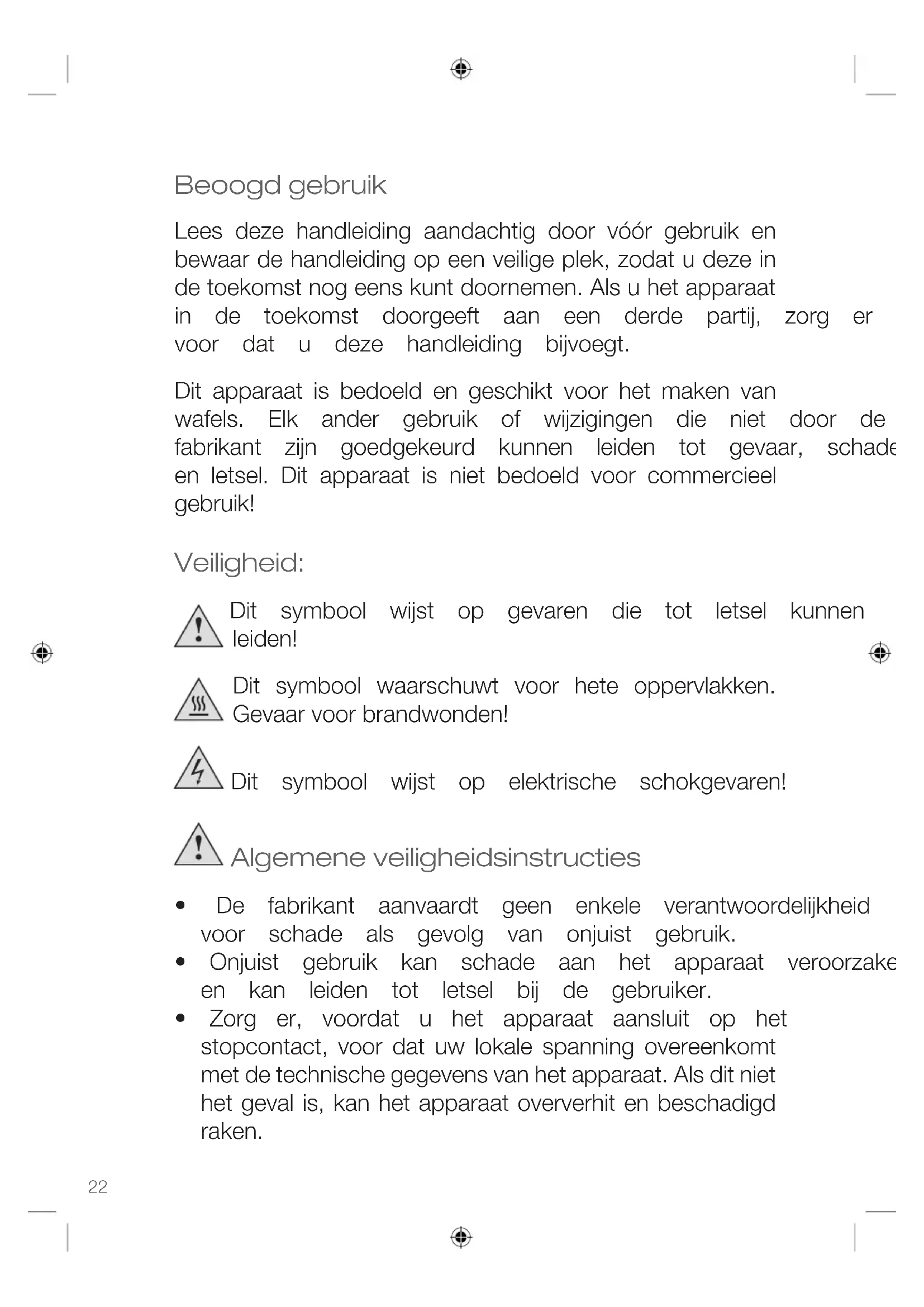 - for damages caused by owner This guarantee does not affect your statutory right, nor any legal right you may have as a custumer under applicable national legislation governing the purchase of goods. In order to assert his/her right in a guarantee case during the guaranteed period, the customer must provide evidence of the date of purchase (receipt). The guarantee is to be asserted against KORONA electric GmbH, Sundern/Germany. Telephone Hotline: +49 2933 90284-80 Mail: service@korona-electric.de web: www.korona-electric.de within 2 years after the date of purchase. In case of guarantee the customer is given the right to get the appliance repaired at our own or at an authorized shop. Further rights (due to guarantee case) are not given to the customer.22 Beoogd gebruik Lees deze handleiding aandachtig door vóór gebruik en bewaar de handleiding op een veilige plek, zodat u deze in de toekomst nog eens kunt doornemen. Als u het apparaat in de toekomst doorgeeft aan een derde partij, zorg er dan voor dat u deze handleiding bijvoegt. Dit apparaat is bedoeld en geschikt voor het maken van wafels. Elk ander gebruik of wijzigingen die niet door de fabrikant zijn goedgekeurd kunnen leiden tot gevaar, schade en letsel. Dit apparaat is niet bedoeld voor commercieel gebruik! Veiligheid: Dit symbool wijst op gevaren die tot letsel kunnen leiden! Dit symbool waarschuwt voor hete oppervlakken. Gevaar voor brandwonden! Dit symbool wijst op elektrische schokgevaren! Algemene veiligheidsinstructies